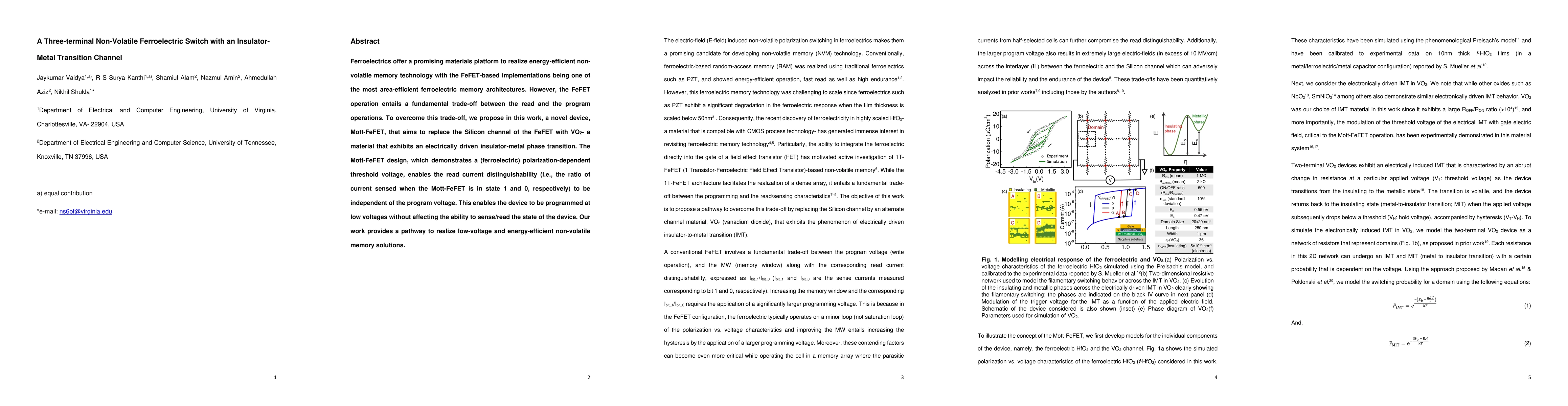 This research proposes a novel three-terminal non-volatile ferroelectric switch, the Mott-FeFET, that replaces the silicon channel with VO2 to achieve an insulator-metal transition, enabling low-voltage programming while maintaining distinct read current states. This design offers an energy-efficient non-volatile memory solution.