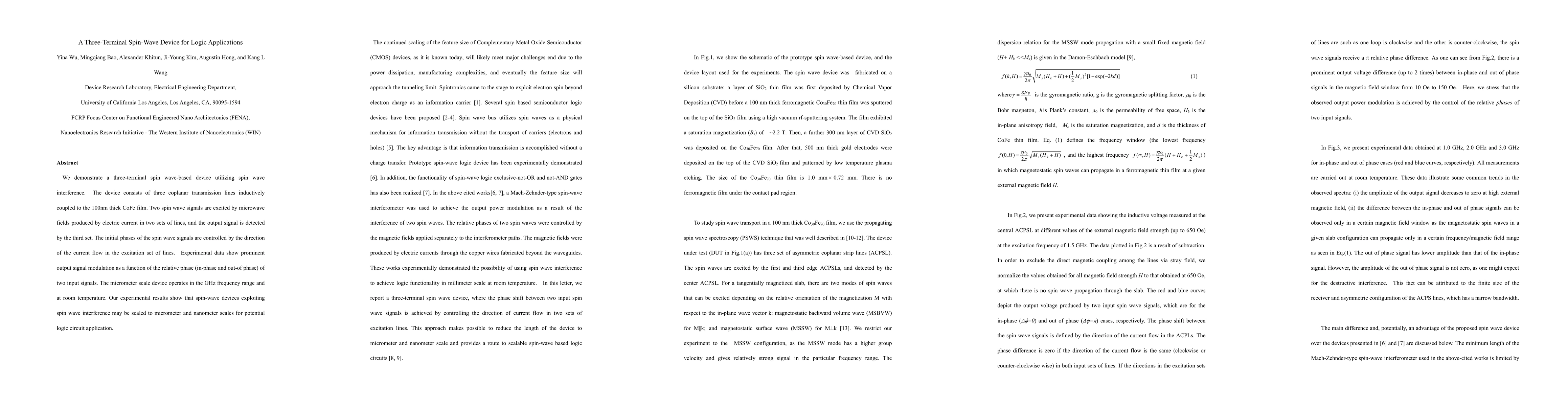 This research demonstrates a three-terminal spin-wave device that utilizes spin wave interference for logic applications. The device operates in the GHz frequency range at room temperature and shows significant output signal modulation based on the relative phase of input signals, indicating potential for scalable logic circuits.