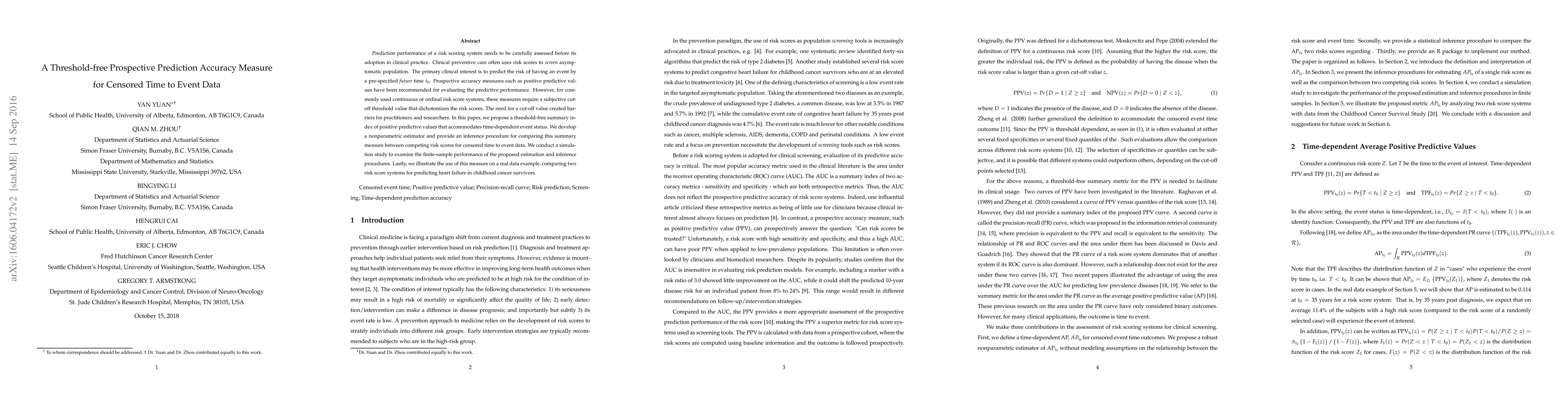 Prediction performance of a risk scoring system needs to be carefully assessed before its adoption in clinical practice. Clinical preventive care often uses risk scores to screen asymptomatic population. The primary clinical interest is to predict the risk of having an event by a pre-specified future time $t_0$. Prospective accuracy measures such as positive predictive values have been recommended for evaluating the predictive performance. However, for commonly used continuous or ordinal risk score systems, these measures require a subjective cutoff threshold value that dichotomizes the risk scores. The need for a cut-off value created barriers for practitioners and researchers. In this paper, we propose a threshold-free summary index of positive predictive values that accommodates time-dependent event status. We develop a nonparametric estimator and provide an inference procedure for comparing this summary measure between competing risk scores for censored time to event data. We conduct a simulation study to examine the finite-sample performance of the proposed estimation and inference procedures. Lastly, we illustrate the use of this measure on a real data example, comparing two risk score systems for predicting heart failure in childhood cancer survivors.