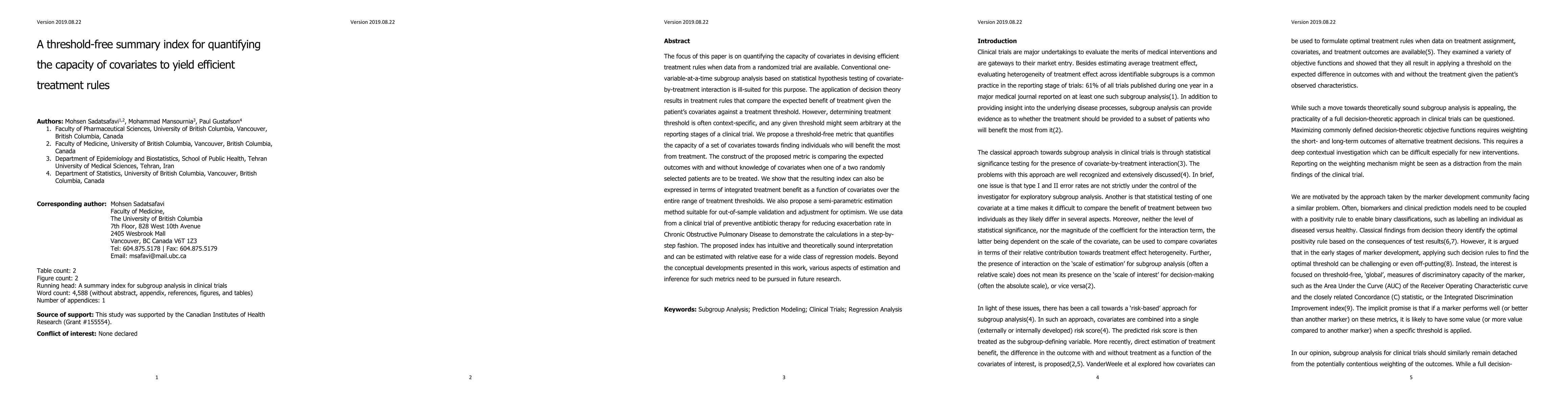 The focus of this paper is on quantifying the capacity of covariates in devising efficient treatment rules when data from a randomized trial are available. Conventional one-variable-at-a-time subgroup analysis based on statistical hypothesis testing of covariate-by-treatment interaction is ill-suited for this purpose. The application of decision theory results in treatment rules that compare the expected benefit of treatment given the patient's covariates against a treatment threshold. However, determining treatment threshold is often context-specific, and any given threshold might seem arbitrary at the reporting stages of a clinical trial. We propose a threshold-free metric that quantifies the capacity of a set of covariates towards finding individuals who will benefit the most from treatment. The construct of the proposed metric is comparing the expected outcomes with and without knowledge of covariates when one of a two randomly selected patients are to be treated. We show that the resulting index can also be expressed in terms of integrated treatment benefit as a function of covariates over the entire range of treatment thresholds. We also propose a semi-parametric estimation method suitable for out-of-sample validation and adjustment for optimism. We use data from a clinical trial of preventive antibiotic therapy for reducing exacerbation rate in Chronic Obstructive Pulmonary Disease to demonstrate the calculations in a step-by-step fashion. The proposed index has intuitive and theoretically sound interpretation and can be estimated with relative ease for a wide class of regression models. Beyond the conceptual developments presented in this work, various aspects of estimation and inference for such metrics need to be pursued in future research.
