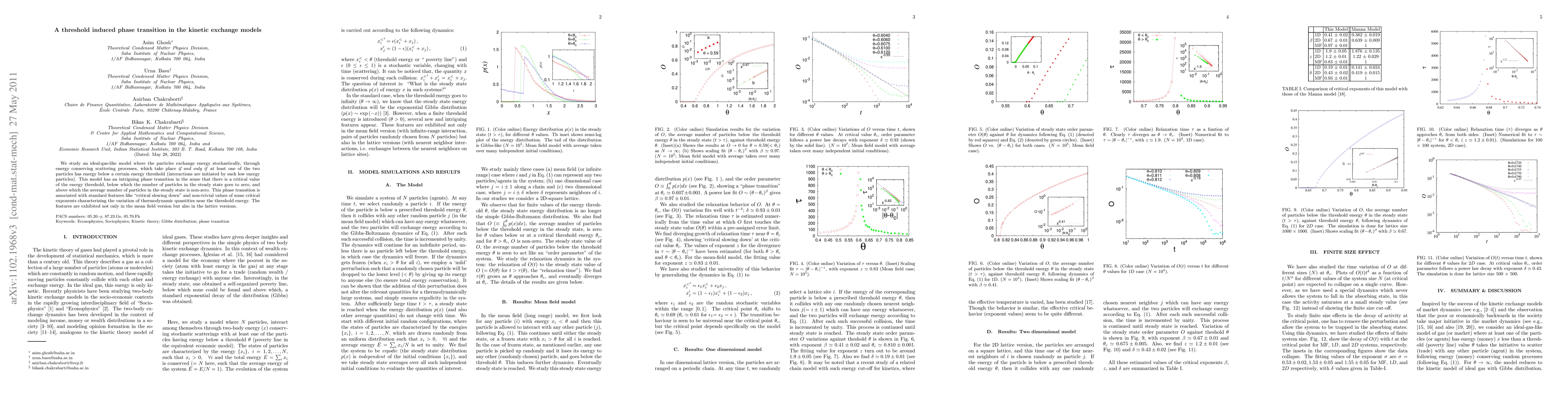 The research explores a unique phase transition in a stochastic energy exchange model of ideal gas particles, where interactions occur only if a particle's energy is below a threshold. Below a critical threshold, particle count in steady state diminishes to zero; above it, the average number of particles is non-zero. This transition, characterized by 'critical slowing down' and specific exponent values, is observed in both mean-field and lattice model versions.