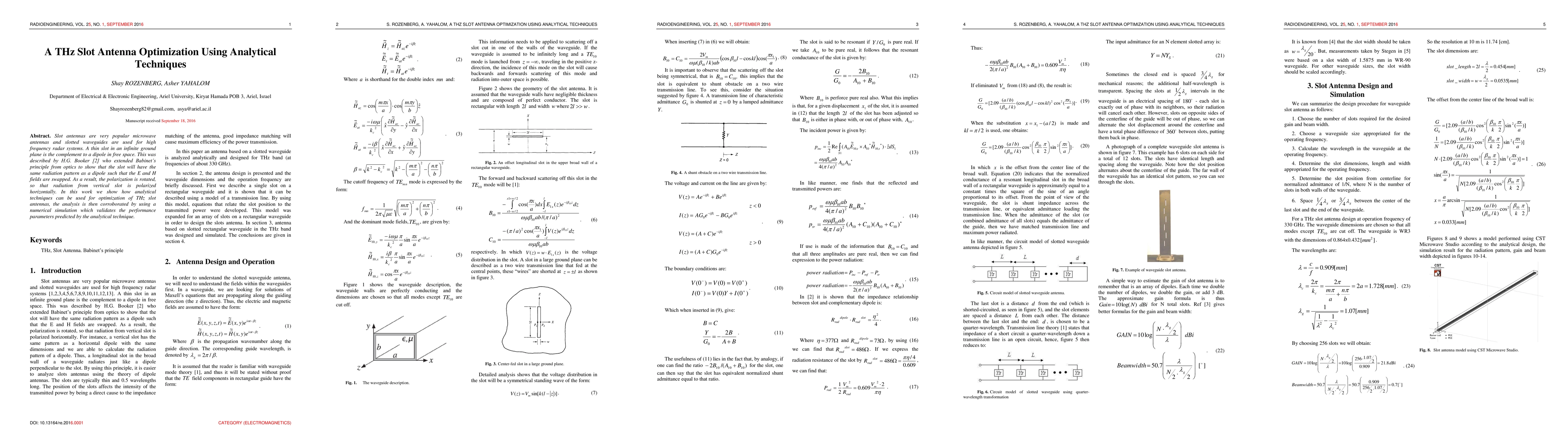Slot antennas are very popular microwave antennas and slotted wave guides are used for high frequency radar systems. A thin slot in an infinite ground plane is the complement to a dipole in free space. This was described by H.G. Booker [2] who extended Babinet's principle from optics to show that the slot will have the same radiation pattern as a dipole such that the E and H fields are swapped. As a result, the polarization is rotated, so that radiation from vertical slot is polarized horizontally. In this work we show how analytical techniques can be used for optimization of THz slot antennas, the analysis is then corroborated by using a numerical simulation which validates the performance parameters predicted by the analytical technique.