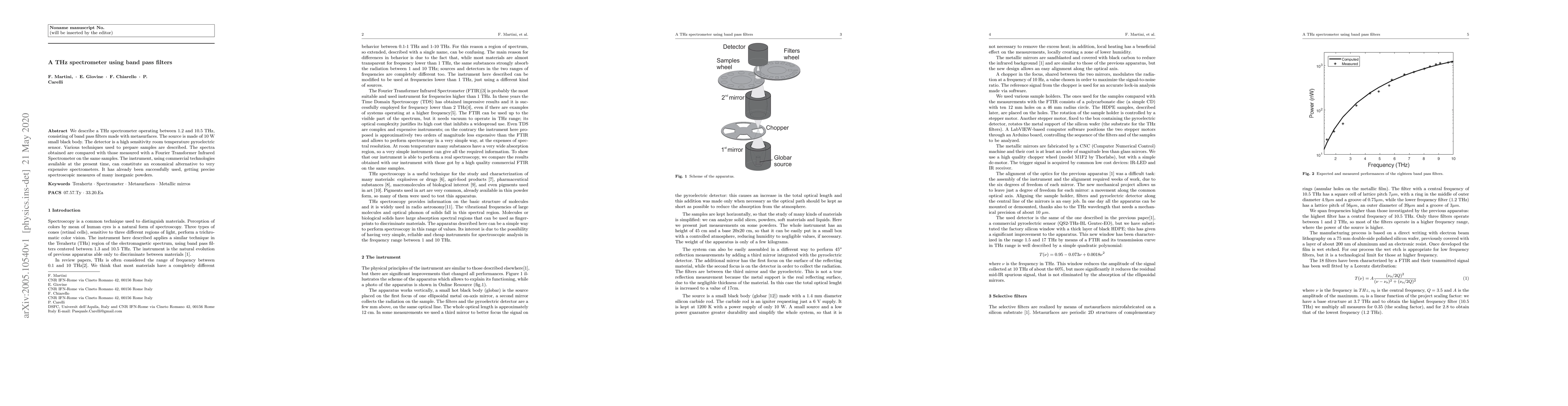 This paper details a cost-effective THz spectrometer utilizing metasurface band pass filters and a pyroelectric detector, demonstrating its precision in measuring inorganic powders and comparing favorably with Fourier Transformer Infrared Spectrometers.