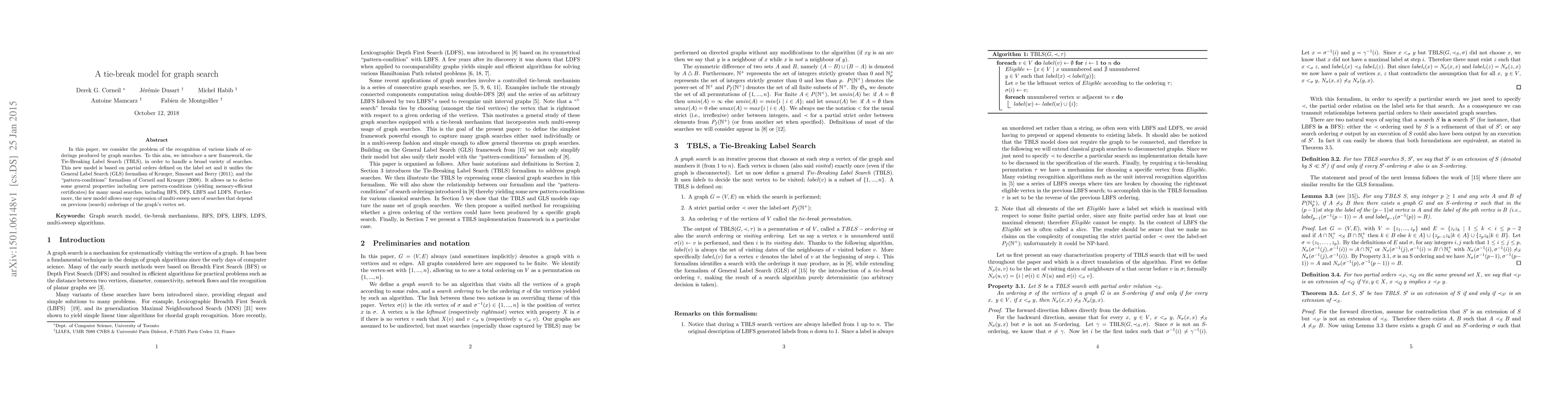The Tie-Breaking Label Search model provides a new framework for graph search to handle various orderings, unifying existing formalisms and allowing for efficient memory certificates and multi-sweep uses of searches.