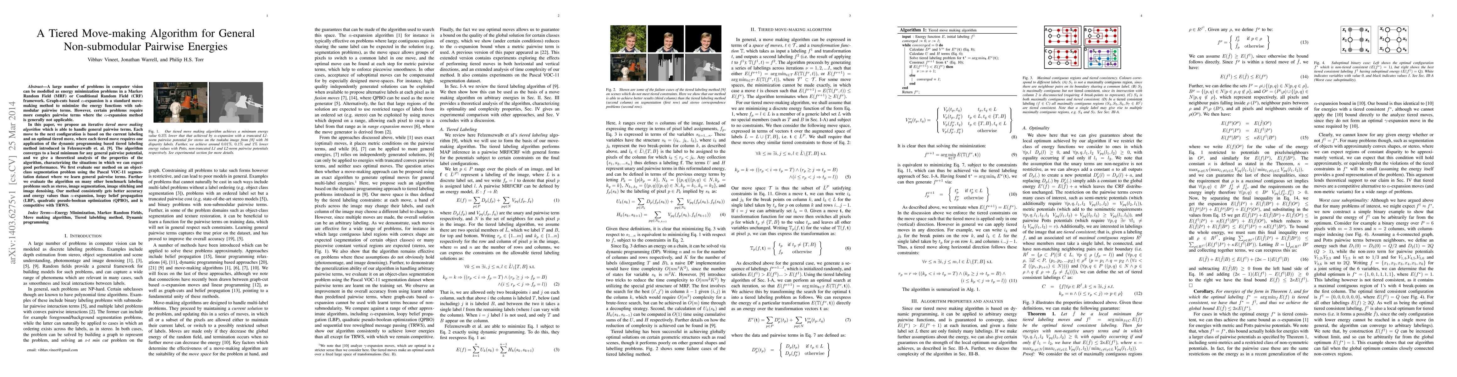 A large number of problems in computer vision can be modelled as energy minimization problems in a Markov Random Field (MRF) or Conditional Random Field (CRF) framework. Graph-cuts based $\alpha$-expansion is a standard move-making method to minimize the energy functions with sub-modular pairwise terms. However, certain problems require more complex pairwise terms where the $\alpha$-expansion method is generally not applicable. In this paper, we propose an iterative {\em tiered move making algorithm} which is able to handle general pairwise terms. Each move to the next configuration is based on the current labeling and an optimal tiered move, where each tiered move requires one application of the dynamic programming based tiered labeling method introduced in Felzenszwalb et. al. \cite{tiered_cvpr_felzenszwalbV10}. The algorithm converges to a local minimum for any general pairwise potential, and we give a theoretical analysis of the properties of the algorithm, characterizing the situations in which we can expect good performance. We first evaluate our method on an object-class segmentation problem using the Pascal VOC-11 segmentation dataset where we learn general pairwise terms. Further we evaluate the algorithm on many other benchmark labeling problems such as stereo, image segmentation, image stitching and image denoising. Our method consistently gets better accuracy and energy values than alpha-expansion, loopy belief propagation (LBP), quadratic pseudo-boolean optimization (QPBO), and is competitive with TRWS.