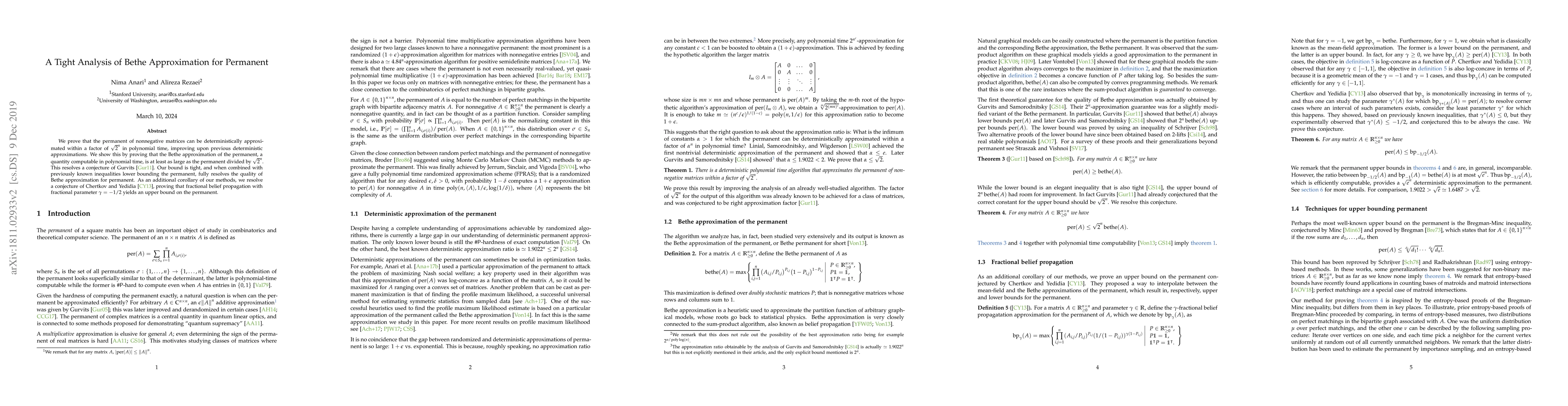 This paper proves a deterministic polynomial-time approximation of the permanent of nonnegative matrices within a factor of $\sqrt{2}^n$, improving previous methods. It demonstrates the Bethe approximation's equivalence to the permanent divided by $\sqrt{2}^{n}$, resolving Gurvits' conjecture and fully determining the approximation's quality.