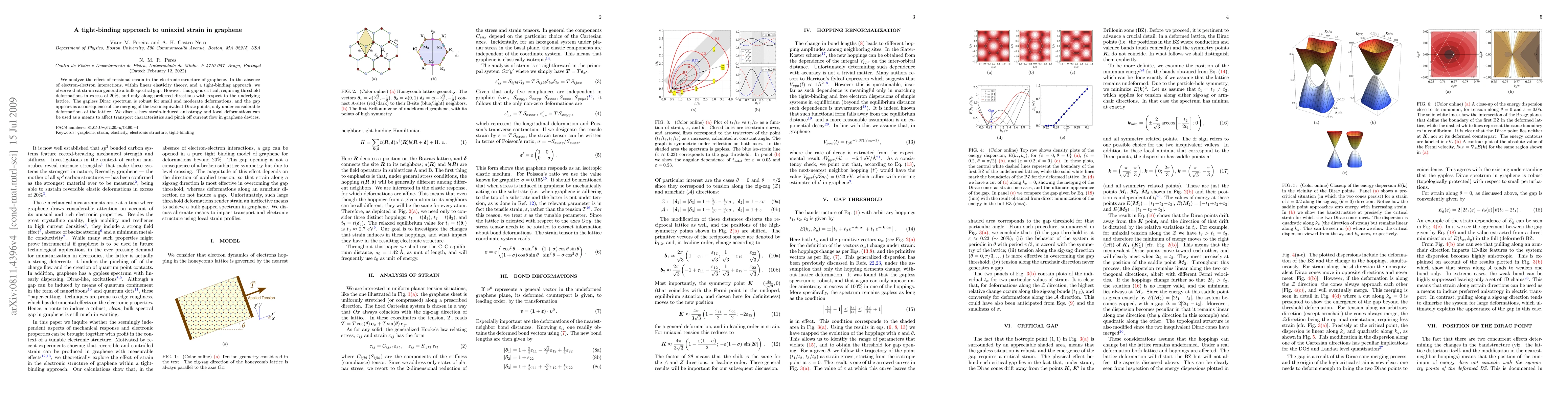 This paper investigates the impact of uniaxial strain on graphene's electronic structure using a tight-binding approach, revealing that significant deformations (over 20%) are required to create a critical bulk spectral gap, primarily along specific lattice directions. The study highlights how strain can modify transport properties and potentially pinch off current flow in graphene devices.