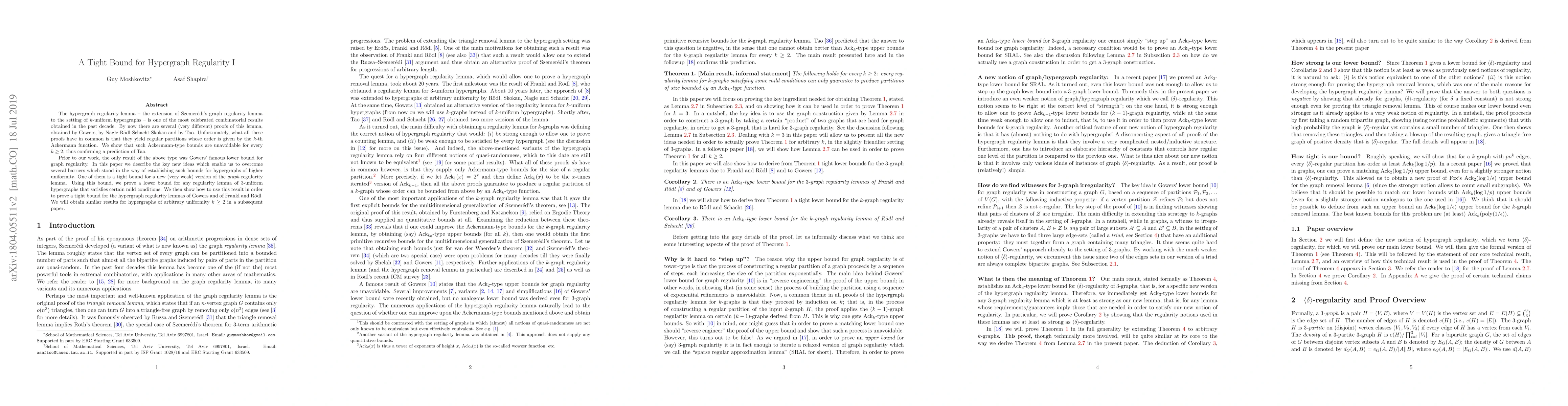 The hypergraph regularity lemma -- the extension of Szemer\'edi's graph regularity lemma to the setting of $k$-uniform hypergraphs -- is one of the most celebrated combinatorial results obtained in the past decade. By now there are several (very different) proofs of this lemma, obtained by Gowers, by Nagle-R\"odl-Schacht-Skokan and by Tao. Unfortunately, what all these proofs have in common is that they yield regular partitions whose order is given by the $k$-th Ackermann function. We show that such Ackermann-type bounds are unavoidable for every $k \ge 2$, thus confirming a prediction of Tao. Prior to our work, the only result of the above type was Gowers' famous lower bound for graph regularity. In this paper we describe the key new ideas which enable us to overcome several barriers which stood in the way of establishing such bounds for hypergraphs of higher uniformity. One of them is a tight bound for a new (very weak) version of the {\em graph} regularity lemma. Using this bound, we prove a lower bound for any regularity lemma of $3$-uniform hypergraphs that satisfies certain mild conditions. We then show how to use this result in order to prove a tight bound for the hypergraph regularity lemmas of Gowers and Frankl--R\"odl. We will obtain similar results for hypergraphs of arbitrary uniformity $k\geq 2$ in a subsequent paper.