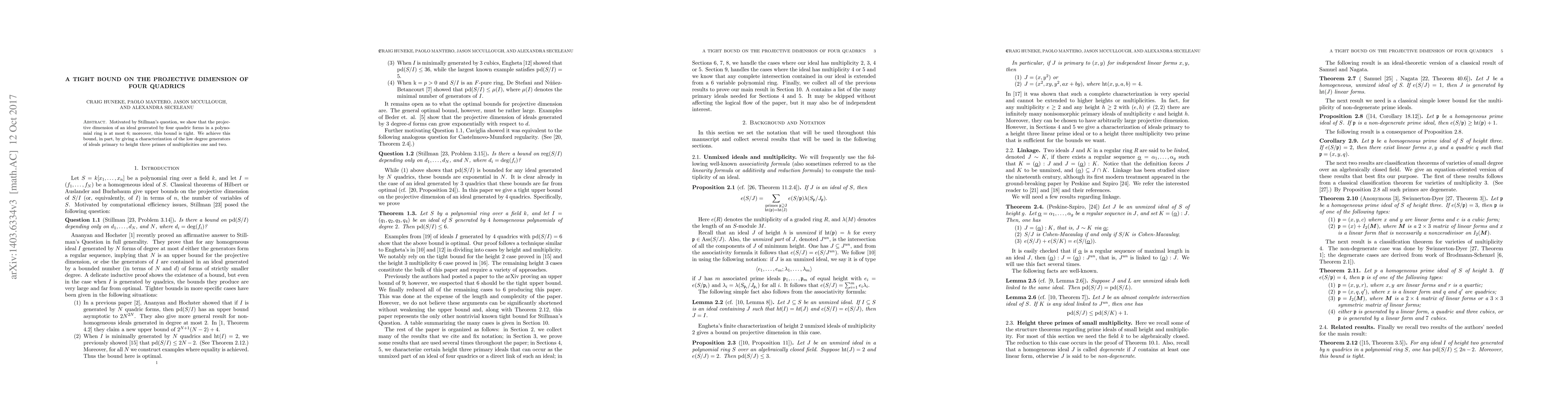 This paper establishes that the projective dimension of an ideal generated by four quadric forms is at most 6, demonstrating that this bound is tight. It also characterizes the low-degree generators of ideals primary to height three primes with multiplicities one and two.