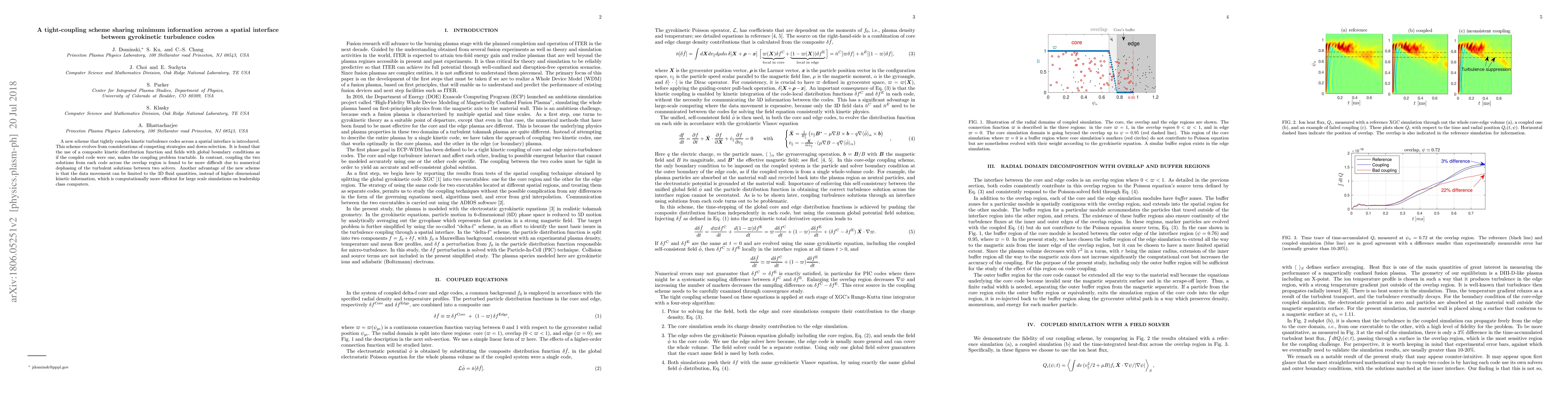 A new scheme that tightly couples kinetic turbulence codes across a spatial interface is introduced. This scheme evolves from considerations of competing strategies and down-selection. It is found that the use of a composite kinetic distribution function and fields with global boundary conditions as if the coupled code were one, makes the coupling problem tractable. In contrast, coupling the two solutions from each code across the overlap region is found to be more difficult due to numerical dephasing of the turbulent solutions between two solvers. Another advantage of the new scheme is that the data movement can be limited to the 3D fluid quantities, instead of higher dimensional kinetic information, which is computationally more efficient for large scale simulations on leadership class computers.