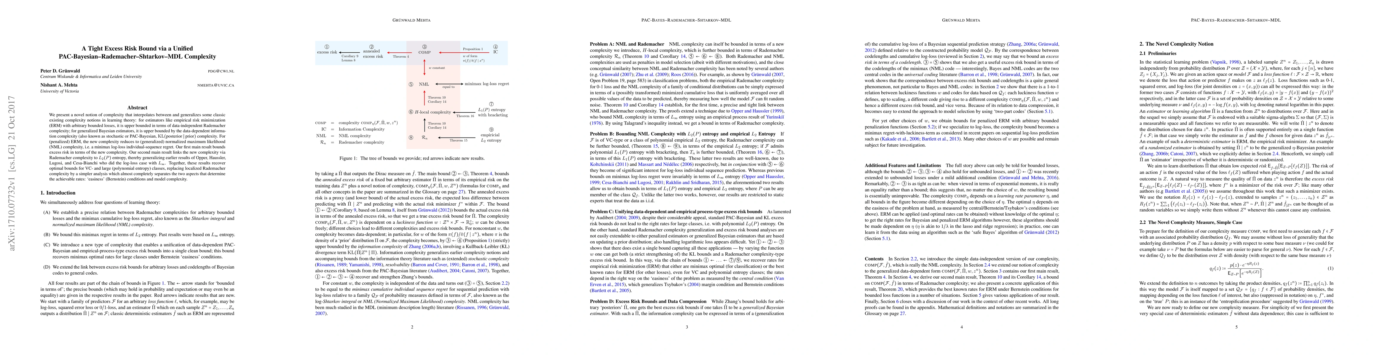 We present a novel notion of complexity that interpolates between and generalizes some classic existing complexity notions in learning theory: for estimators like empirical risk minimization (ERM) with arbitrary bounded losses, it is upper bounded in terms of data-independent Rademacher complexity; for generalized Bayesian estimators, it is upper bounded by the data-dependent information complexity (also known as stochastic or PAC-Bayesian, $\mathrm{KL}(\text{posterior} \operatorname{\|} \text{prior})$ complexity. For (penalized) ERM, the new complexity reduces to (generalized) normalized maximum likelihood (NML) complexity, i.e. a minimax log-loss individual-sequence regret. Our first main result bounds excess risk in terms of the new complexity. Our second main result links the new complexity via Rademacher complexity to $L_2(P)$ entropy, thereby generalizing earlier results of Opper, Haussler, Lugosi, and Cesa-Bianchi who did the log-loss case with $L_\infty$. Together, these results recover optimal bounds for VC- and large (polynomial entropy) classes, replacing localized Rademacher complexity by a simpler analysis which almost completely separates the two aspects that determine the achievable rates: 'easiness' (Bernstein) conditions and model complexity.