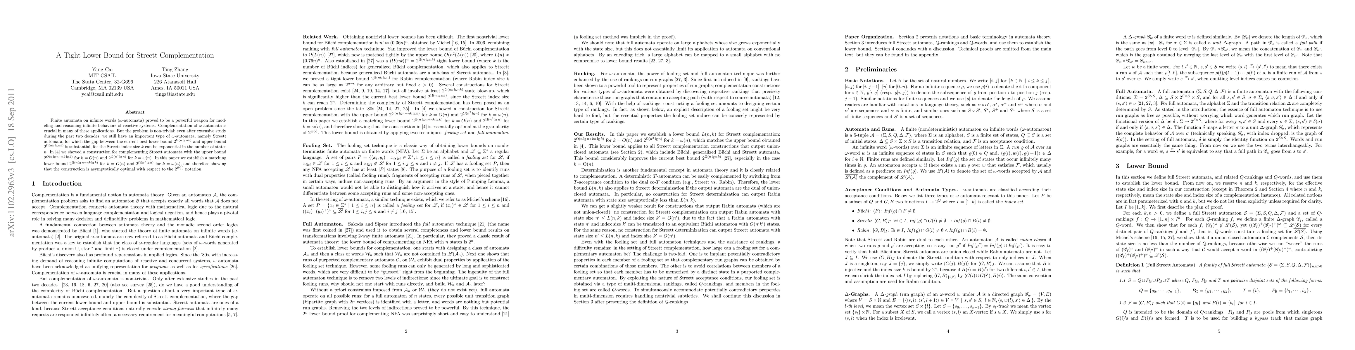 Finite automata on infinite words ($\omega$-automata) proved to be a powerful weapon for modeling and reasoning infinite behaviors of reactive systems. Complementation of $\omega$-automata is crucial in many of these applications. But the problem is non-trivial; even after extensive study during the past four decades, we still have an important type of $\omega$-automata, namely Streett automata, for which the gap between the current best lower bound $2^{\Omega(n \lg nk)}$ and upper bound $2^{\Omega(nk \lg nk)}$ is substantial, for the Streett index size $k$ can be exponential in the number of states $n$. In arXiv:1102.2960 we showed a construction for complementing Streett automata with the upper bound $2^{O(n \lg n+nk \lg k)}$ for $k = O(n)$ and $2^{O(n^{2} \lg n)}$ for $k=\omega(n)$. In this paper we establish a matching lower bound $2^{\Omega(n \lg n+nk \lg k)}$ for $k = O(n)$ and $2^{\Omega(n^{2} \lg n)}$ for $k = \omega(n)$, and therefore showing that the construction is asymptotically optimal with respect to the $2^{\Theta(\cdot)}$ notation.