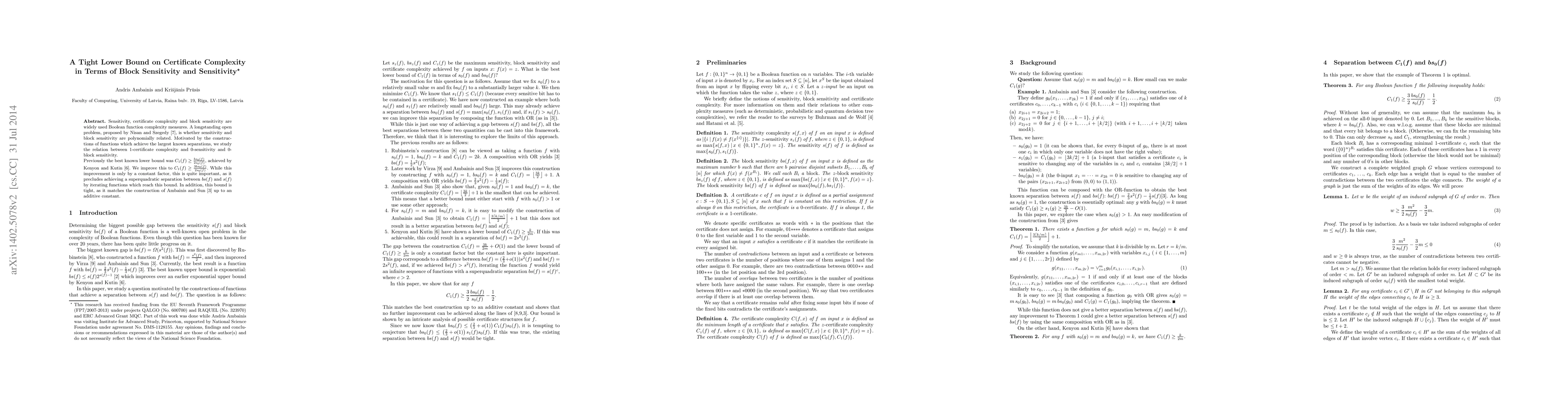 This paper establishes a tighter lower bound on 1-certificate complexity in terms of 0-block sensitivity and 0-sensitivity, improving the previous bound by a constant factor. The new bound precludes a superquadratic separation between block sensitivity and sensitivity, and matches a known construction up to an additive constant.