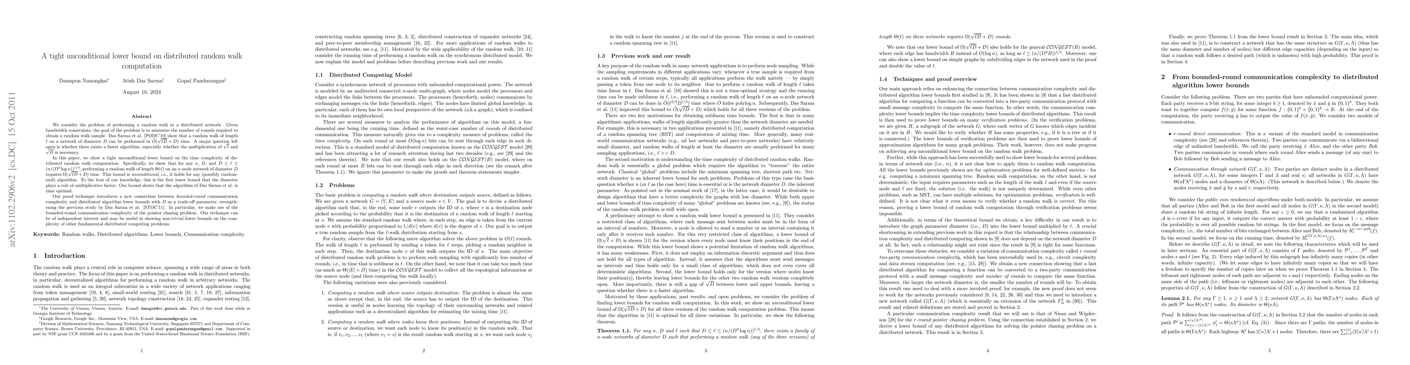 This paper establishes a tight unconditional lower bound on the time complexity of distributed random walk computation, showing that any algorithm must take at least $\Omega(\sqrt{\ell D}+D)$ time for certain parameters. This result confirms the optimality of the algorithm by Das Sarma et al. and introduces a novel connection between bounded-round communication complexity and distributed algorithm lower bounds.