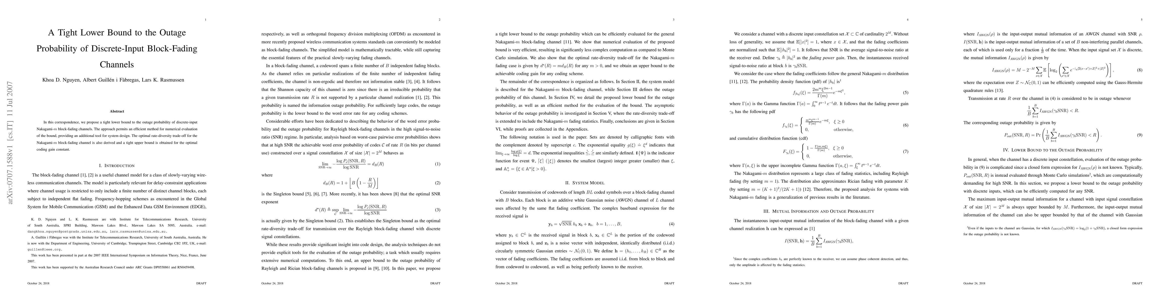 In this correspondence, we propose a tight lower bound to the outage probability of discrete-input Nakagami-m block-fading channels. The approach permits an efficient method for numerical evaluation of the bound, providing an additional tool for system design. The optimal rate-diversity trade-off for the Nakagami-m block-fading channel is also derived and a tight upper bound is obtained for the optimal coding gain constant.