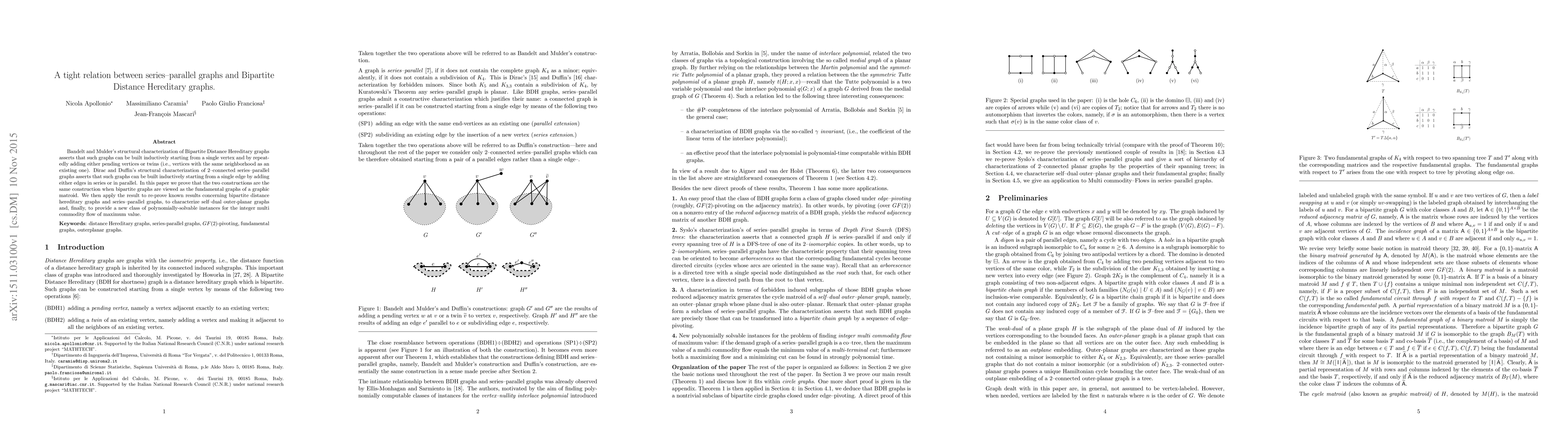 Bandelt and Mulder's structural characterization of Bipartite Distance Hereditary graphs asserts that such graphs can be built inductively starting from a single vertex and by repeatedly adding either pending vertices or twins (i.e., vertices with the same neighborhood as an existing one). Dirac and Duffin's structural characterization of 2-connected series-parallel graphs asserts that such graphs can be built inductively starting from a single edge by adding either edges in series or in parallel. In this paper we prove that the two constructions are the same construction when bipartite graphs are viewed as the fundamental graphs of a graphic matroid. We then apply the result to re-prove known results concerning bipartite distance hereditary graphs and series-parallel graphs, to characterize self-dual outer-planar graphs and, finally, to provide a new class of polynomially-solvable instances for the integer multi commodity flow of maximum value.
