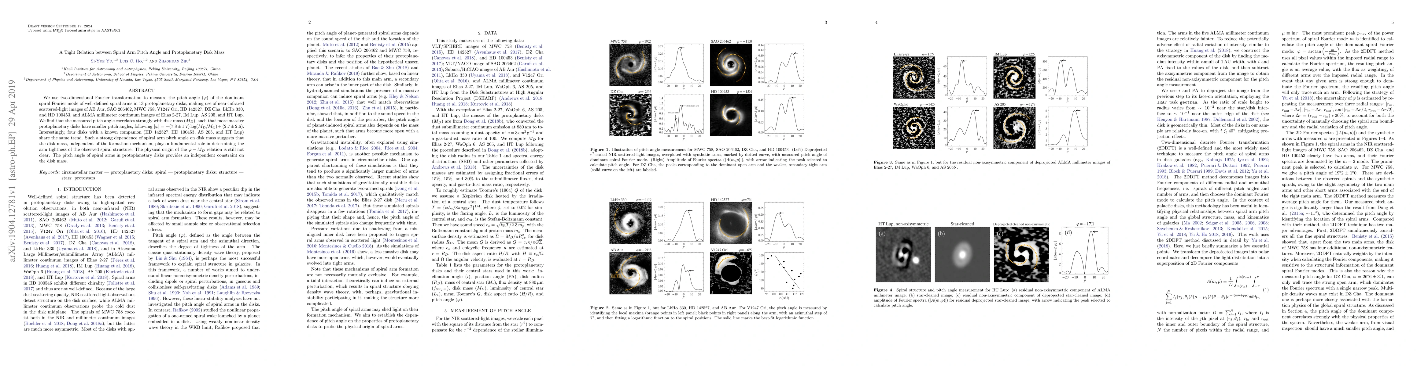 This study reveals a strong correlation between the pitch angle of spiral arms in protoplanetary disks and their mass, suggesting that more massive disks exhibit tighter spiral arms. The observed relationship implies a fundamental role of disk mass in shaping the spiral structure, though the underlying physical mechanism remains unclear.