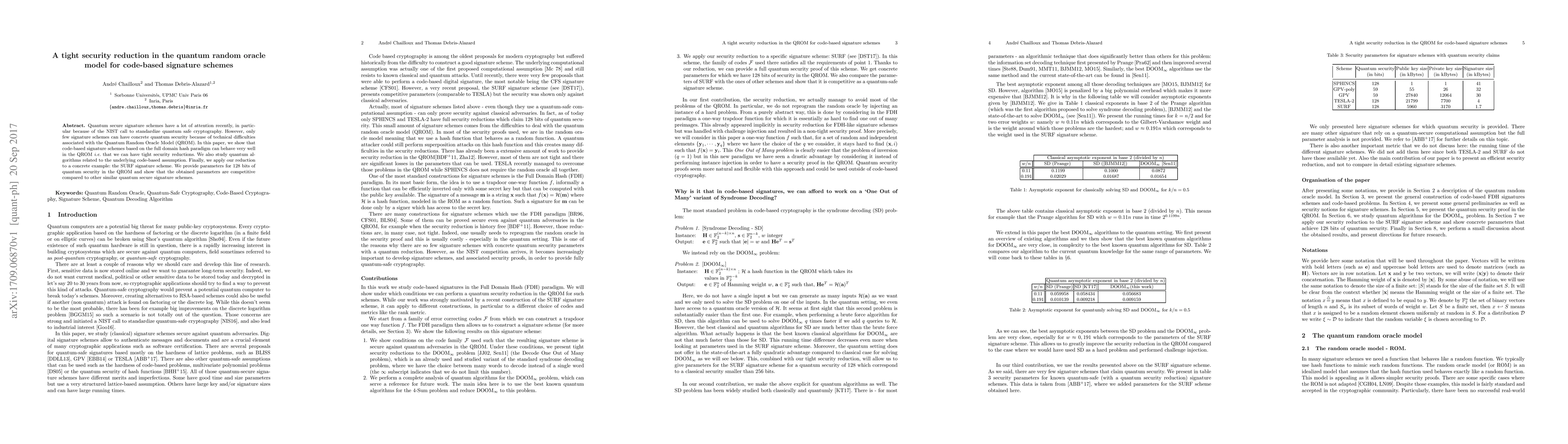 This paper demonstrates tight security reductions for code-based signature schemes in the Quantum Random Oracle Model (QROM), addressing technical difficulties. It applies these reductions to the SURF signature scheme, providing parameters for 128 bits of quantum security that are competitive with other schemes.
