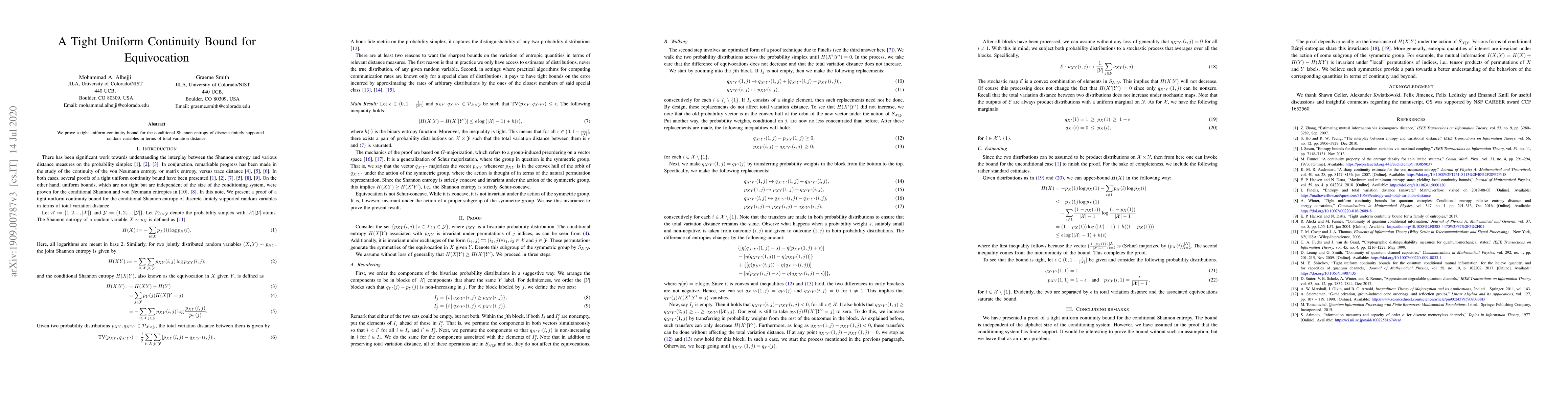 Summary: This paper establishes a tight uniform continuity bound for the conditional Shannon entropy of discrete random variables in relation to their total variation distance, providing a precise measure of how entropy changes with variations in the underlying distributions.