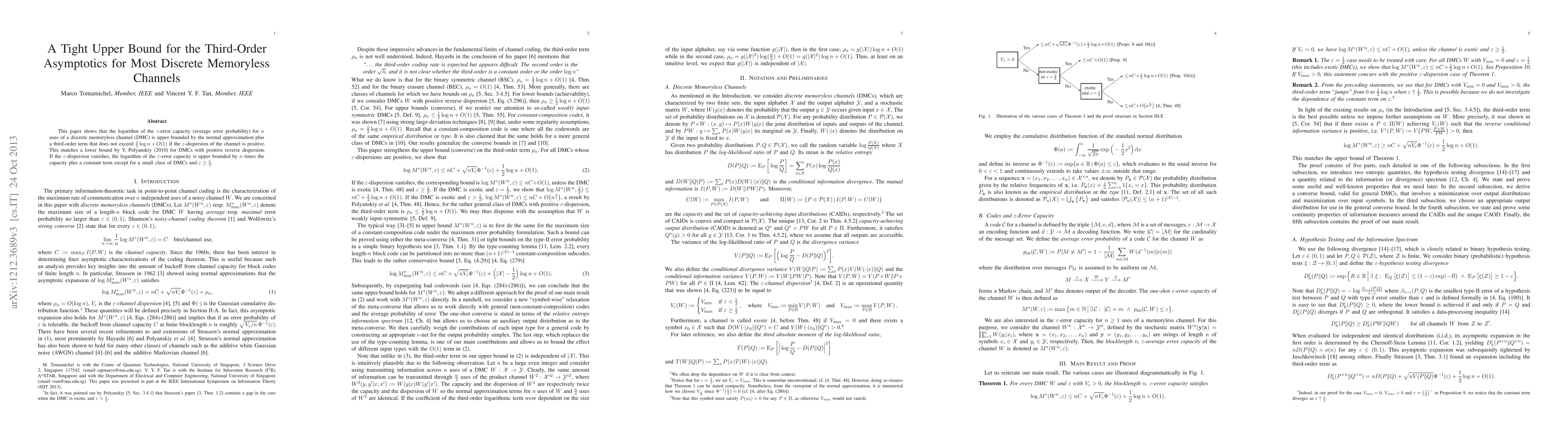This paper shows that the logarithm of the epsilon-error capacity (average error probability) for n uses of a discrete memoryless channel is upper bounded by the normal approximation plus a third-order term that does not exceed 1/2 log n + O(1) if the epsilon-dispersion of the channel is positive. This matches a lower bound by Y. Polyanskiy (2010) for discrete memoryless channels with positive reverse dispersion. If the epsilon-dispersion vanishes, the logarithm of the epsilon-error capacity is upper bounded by the n times the capacity plus a constant term except for a small class of DMCs and epsilon >= 1/2.