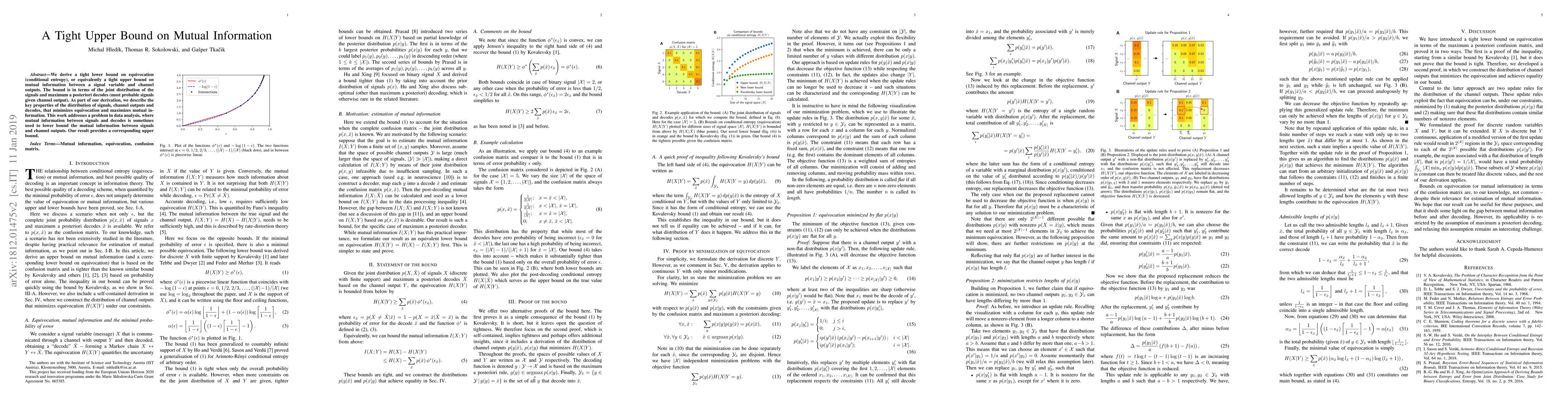 This paper establishes a tight upper bound on mutual information between a signal and channel outputs, derived in terms of the joint distribution of signals and maximum a posteriori decodes. The work also identifies properties that optimize mutual information and provides an upper bound useful for data analysis.