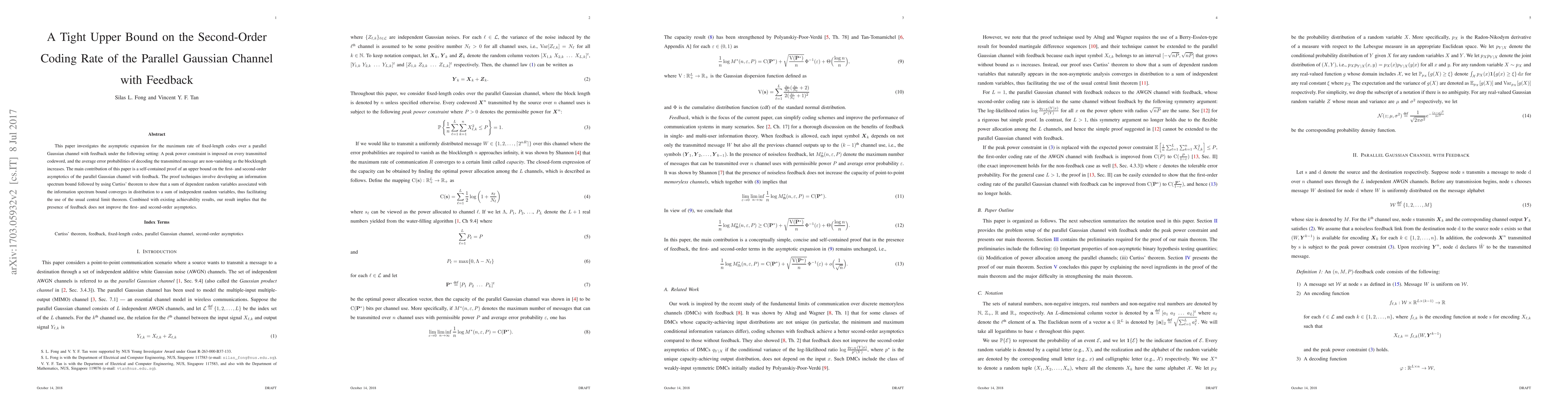 This paper investigates the asymptotic expansion for the maximum rate of fixed-length codes over a parallel Gaussian channel with feedback under the following setting: A peak power constraint is imposed on every transmitted codeword, and the average error probability of decoding the transmitted message is non-vanishing as the blocklength increases. It is well known that the presence of feedback does not increase the first-order asymptotics of the channel, i.e., capacity, in the asymptotic expansion, and the closed-form expression of the capacity can be obtained by the well-known water-filling algorithm. The main contribution of this paper is a self-contained proof of an upper bound on the second-order asymptotics of the parallel Gaussian channel with feedback. The proof techniques involve developing an information spectrum bound followed by using Curtiss' theorem to show that a sum of dependent random variables associated with the information spectrum bound converges in distribution to a sum of independent random variables, thus facilitating the use of the usual central limit theorem. Combined with existing achievability results, our result implies that the presence of feedback does not improve the second-order asymptotics.
