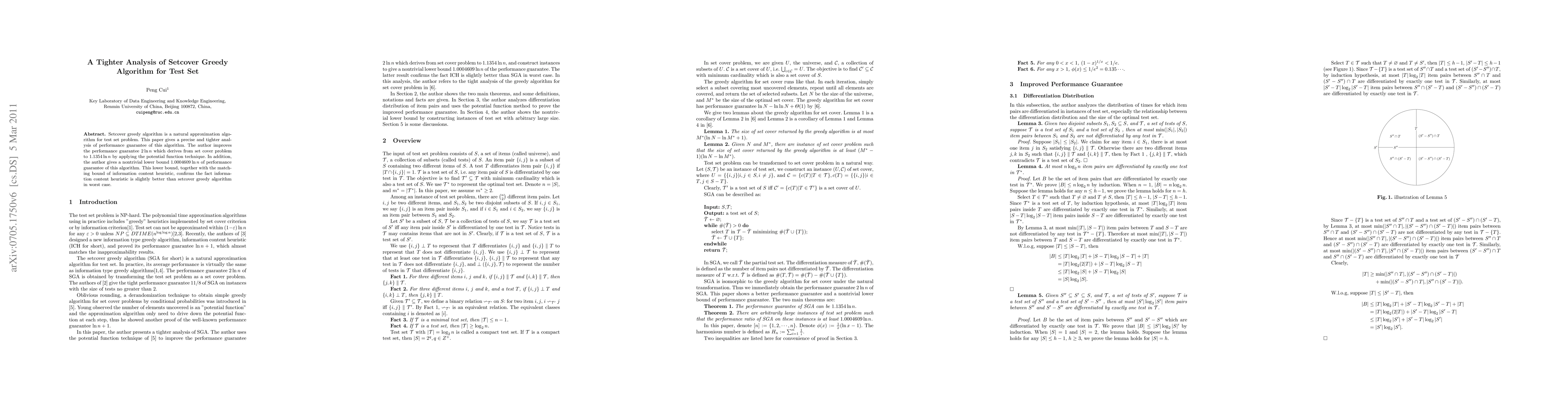 This paper refines the analysis of the setcover greedy algorithm for the test set problem, improving its performance guarantee from $2\ln n$ to $1.1354\ln n$ using potential function techniques. It also establishes a lower bound of $1.0004609\ln n$, demonstrating that the information content heuristic is marginally superior in worst-case scenarios.