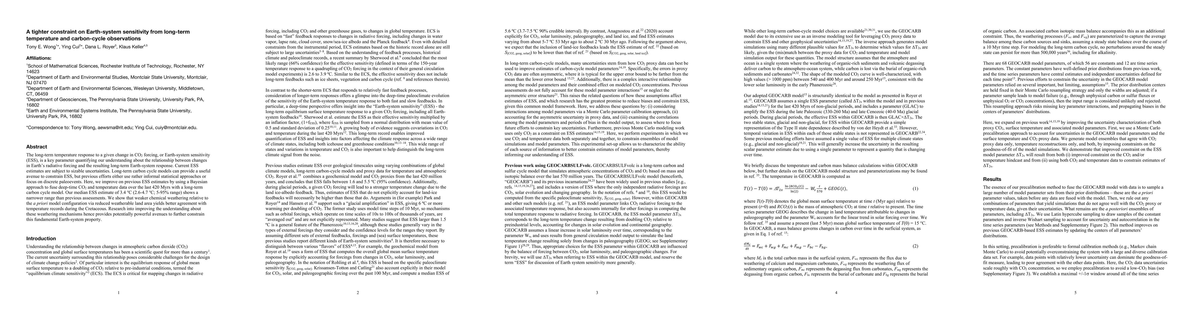 This paper refines estimates of Earth-system sensitivity (ESS) using a Bayesian approach that integrates deep-time CO2 and temperature data over 420 million years, yielding a median ESS of 3.4°C (2.6-4.7°C). The study highlights the importance of chemical weathering mechanisms in refining these estimates.