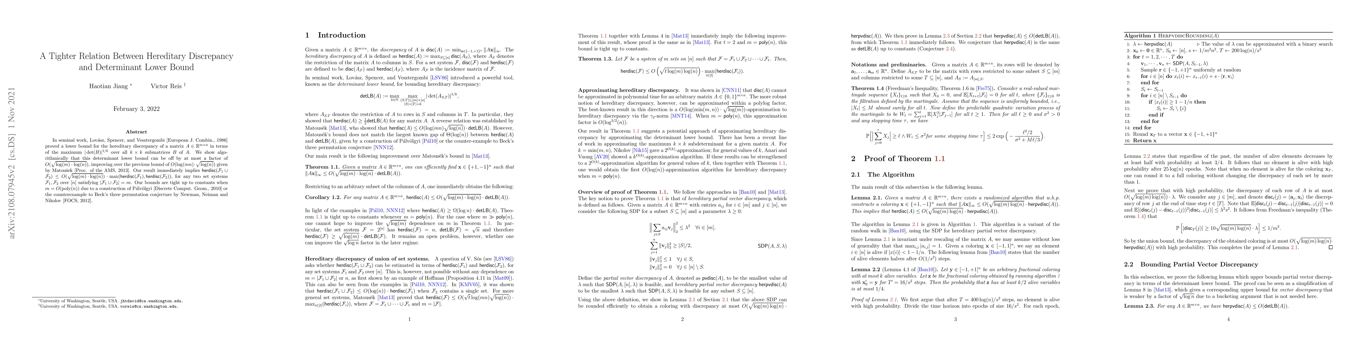 In seminal work, Lov\'asz, Spencer, and Vesztergombi [European J. Combin., 1986] proved a lower bound for the hereditary discrepancy of a matrix $A \in \mathbb{R}^{m \times n}$ in terms of the maximum $|\det(B)|^{1/k}$ over all $k \times k$ submatrices $B$ of $A$. We show algorithmically that this determinant lower bound can be off by at most a factor of $O(\sqrt{\log (m) \cdot \log (n)})$, improving over the previous bound of $O(\log(mn) \cdot \sqrt{\log (n)})$ given by Matou\v{s}ek [Proc. of the AMS, 2013]. Our result immediately implies $\mathrm{herdisc}(\mathcal{F}_1 \cup \mathcal{F}_2) \leq O(\sqrt{\log (m) \cdot \log (n)}) \cdot \max(\mathrm{herdisc}(\mathcal{F}_1), \mathrm{herdisc}(\mathcal{F}_2))$, for any two set systems $\mathcal{F}_1, \mathcal{F}_2$ over $[n]$ satisfying $|\mathcal{F}_1 \cup \mathcal{F}_2| = m$. Our bounds are tight up to constants when $m = O(\mathrm{poly}(n))$ due to a construction of P\'alv\"olgyi [Discrete Comput. Geom., 2010] or the counterexample to Beck's three permutation conjecture by Newman, Neiman and Nikolov [FOCS, 2012].