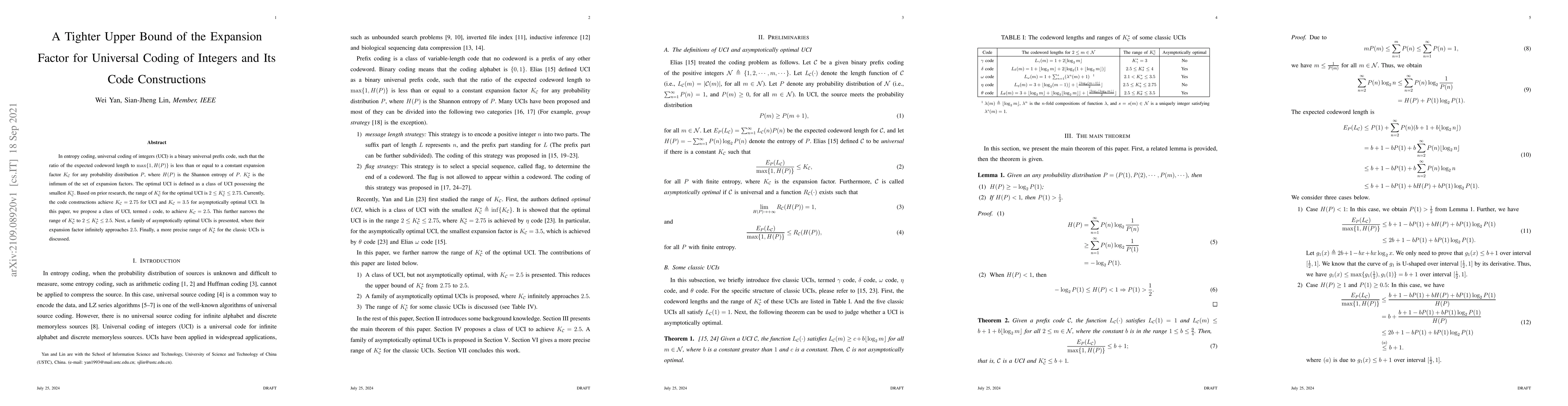 In entropy coding, universal coding of integers~(UCI) is a binary universal prefix code, such that the ratio of the expected codeword length to $\max\{1, H(P)\}$ is less than or equal to a constant expansion factor $K_{\mathcal{C}}$ for any probability distribution $P$, where $H(P)$ is the Shannon entropy of $P$. $K_{\mathcal{C}}^{*}$ is the infimum of the set of expansion factors. The optimal UCI is defined as a class of UCI possessing the smallest $K_{\mathcal{C}}^{*}$. Based on prior research, the range of $K_{\mathcal{C}}^{*}$ for the optimal UCI is $2\leq K_{\mathcal{C}}^{*}\leq 2.75$. Currently, the code constructions achieve $K_{\mathcal{C}}=2.75$ for UCI and $K_{\mathcal{C}}=3.5$ for asymptotically optimal UCI. In this paper, we propose a class of UCI, termed $\iota$ code, to achieve $K_{\mathcal{C}}=2.5$. This further narrows the range of $K_{\mathcal{C}}^{*}$ to $2\leq K_{\mathcal{C}}^{*}\leq 2.5$. Next, a family of asymptotically optimal UCIs is presented, where their expansion factor infinitely approaches $2.5$. Finally, a more precise range of $K_{\mathcal{C}}^{*}$ for the classic UCIs is discussed.