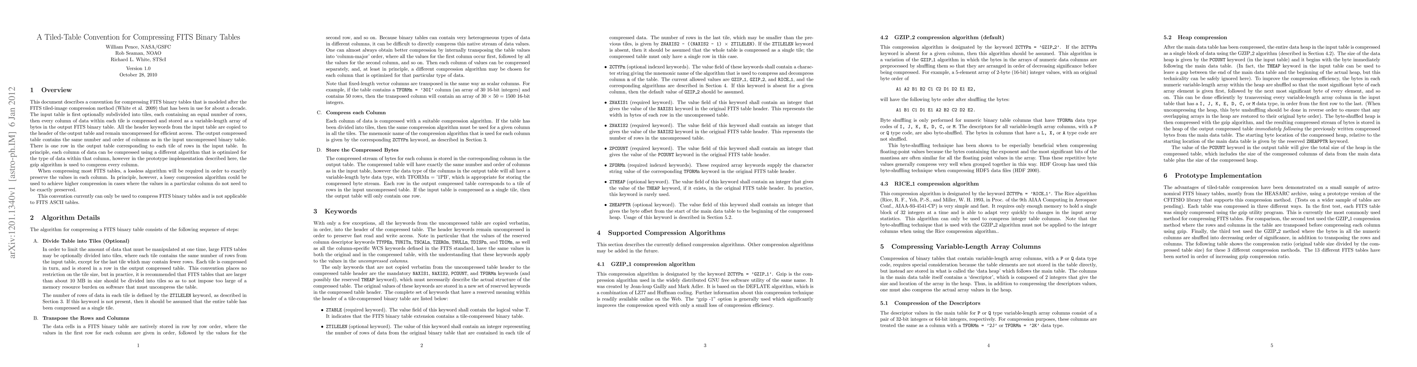 This paper proposes a tiled-table compression method for FITS binary tables, modeled after tiled-image compression, subdividing tables into tiles and compressing each column using gzip, while preserving headers and column order. The compressed table retains one row per tile for efficient access.