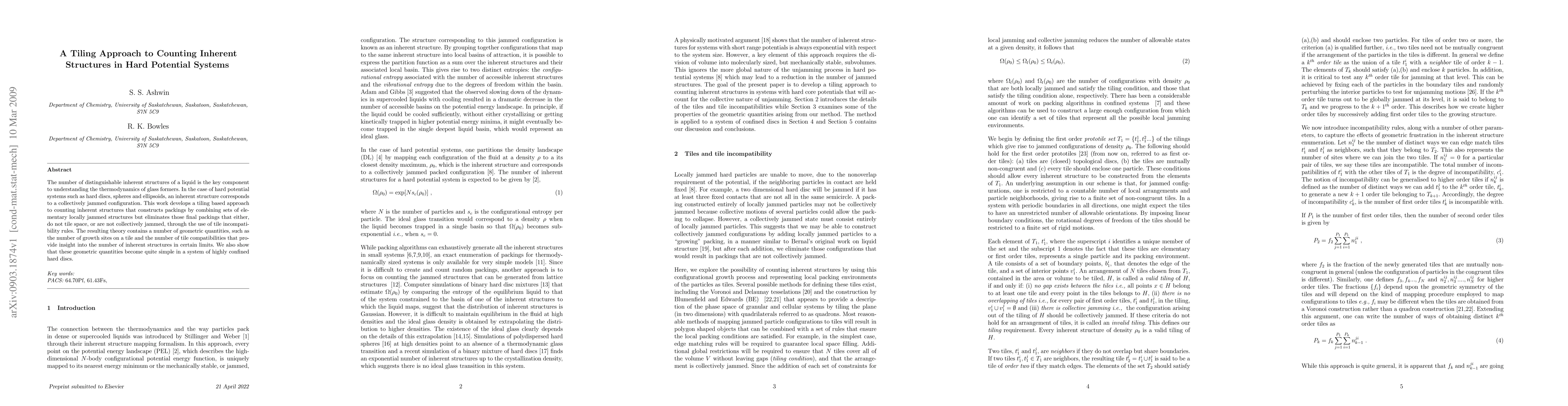 The number of distinguishable inherent structures of a liquid is the key component to understanding the thermodynamics of glass formers. In the case of hard potential systems such as hard discs, spheres and ellipsoids, an inherent structure corresponds to a collectively jammed configuration. This work develops a tiling based approach to counting inherent structures that constructs packings by combining sets of elementary locally jammed structures but eliminates those final packings that either, do not tile space, or are not collectively jammed, through the use of tile incompatibility rules. The resulting theory contains a number of geometric quantities, such as the number of growth sites on a tile and the number of tile compatibilities that provide insight into the number of inherent structures in certain limits. We also show that these geometric quantities become quite simple in a system of highly confined hard discs.