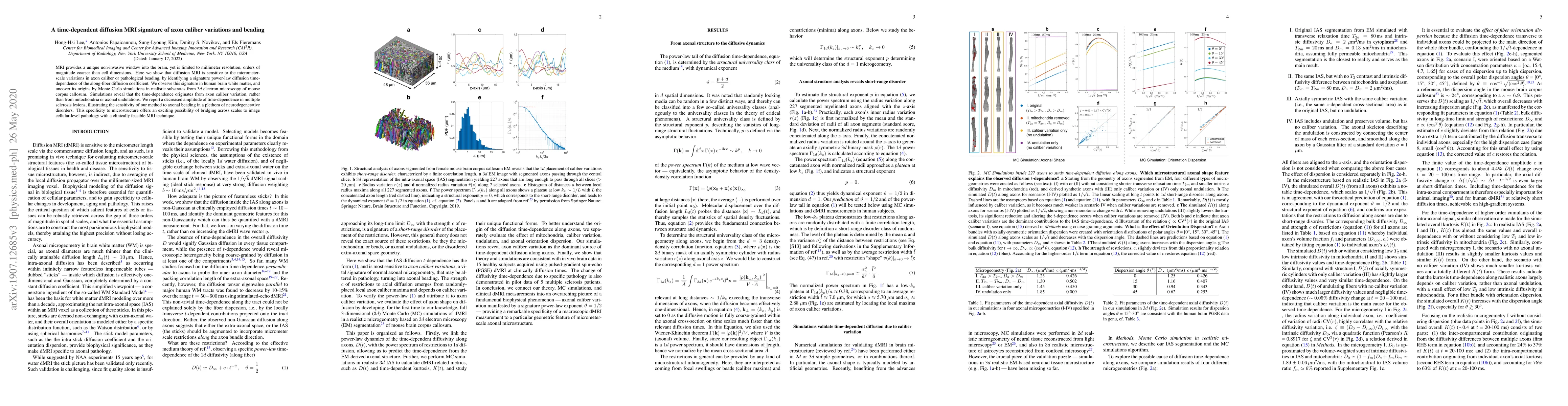 This paper demonstrates that diffusion MRI can detect micrometer-scale variations in axon caliber and pathological beading through a unique power-law diffusion time-dependence. The authors validate their findings using simulations based on 3D electron microscopy data, showing the method's sensitivity to axonal changes, which is further illustrated in multiple sclerosis lesions.