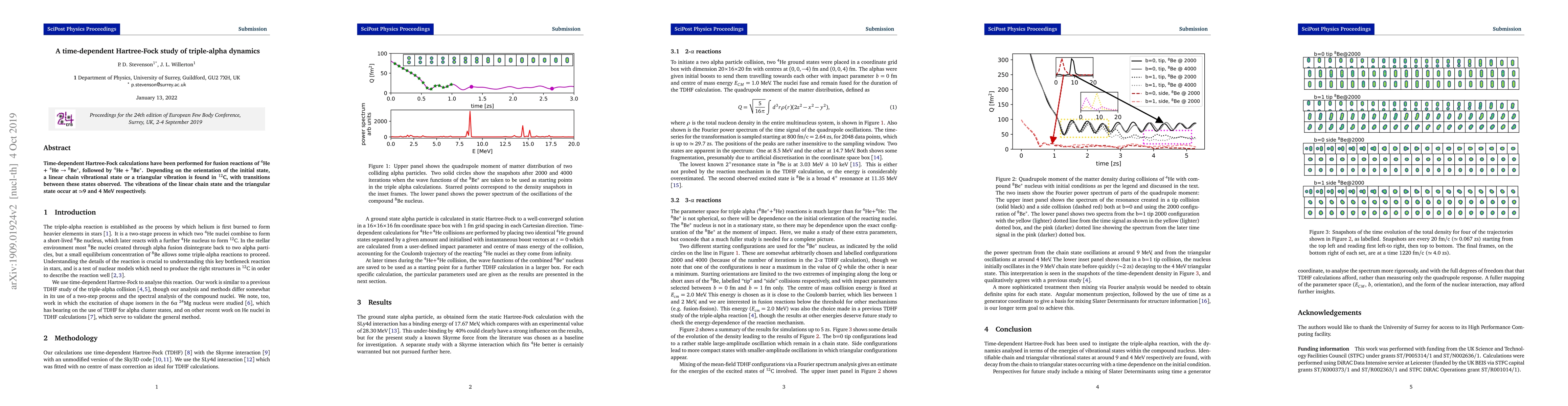 Time-dependent Hartree-Fock calculations have been performed for fusion reactions of He-4 + He-4 -> Be*-8, followed by He-4 + Be*-8 . Depending on the orientation of the initial state, a linear chain vibrational state or a triangular vibration is found in 12C, with transitions between these states observed. The vibrations of the linear chain state and the triangular state occur at ~9 and 4 MeV respectively.