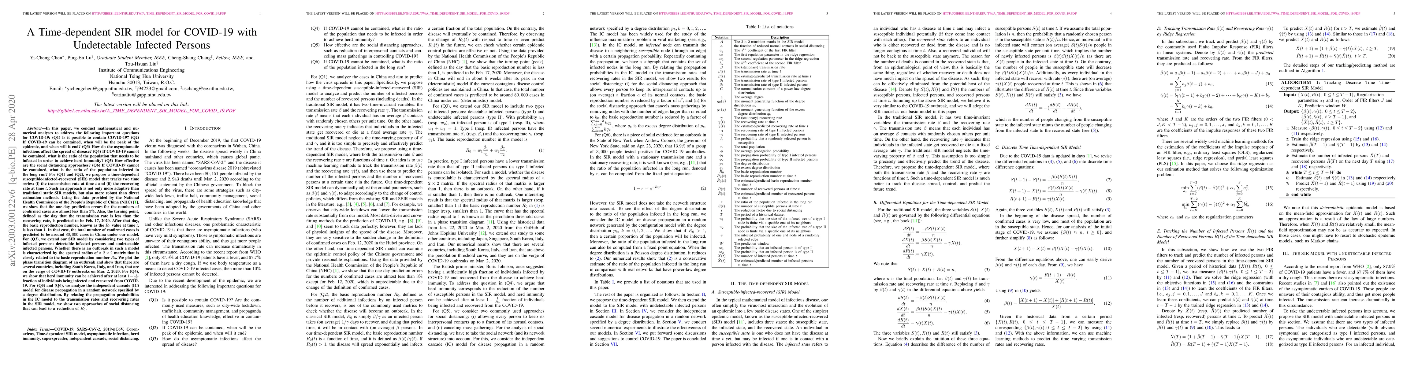 In this paper, we conduct mathematical and numerical analyses to address the following crucial questions for COVID-19: (Q1) Is it possible to contain COVID-19? (Q2) When will be the peak and the end of the epidemic? (Q3) How do the asymptomatic infections affect the spread of disease? (Q4) What is the ratio of the population that needs to be infected to achieve herd immunity? (Q5) How effective are the social distancing approaches? (Q6) What is the ratio of the population infected in the long run? For (Q1) and (Q2), we propose a time-dependent susceptible-infected-recovered (SIR) model that tracks 2 time series: (i) the transmission rate at time t and (ii) the recovering rate at time t. Such an approach is more adaptive than traditional static SIR models and more robust than direct estimation methods. Using the data provided by China, we show that the one-day prediction errors for the numbers of confirmed cases are almost in 3%, and the total number of confirmed cases is precisely predicted. Also, the turning point, defined as the day that the transmission rate is less than the recovering rate can be accurately predicted. After that day, the basic reproduction number $R_0$ is less than 1. For (Q3), we extend our SIR model by considering 2 types of infected persons: detectable and undetectable infected persons. Whether there is an outbreak in such a model is characterized by the spectral radius of a 2 by 2 matrix that is closely related to $R_0$. For (Q4), we show that herd immunity can be achieved after at least 1-1/$R_0$ fraction of individuals being infected. For (Q5) and (Q6), we analyze the independent cascade (IC) model for disease propagation in a configuration random graph. By relating the propagation probabilities in the IC model to the transmission rates and recovering rates in the SIR model, we show 2 approaches of social distancing that can lead to a reduction of $R_0$.
