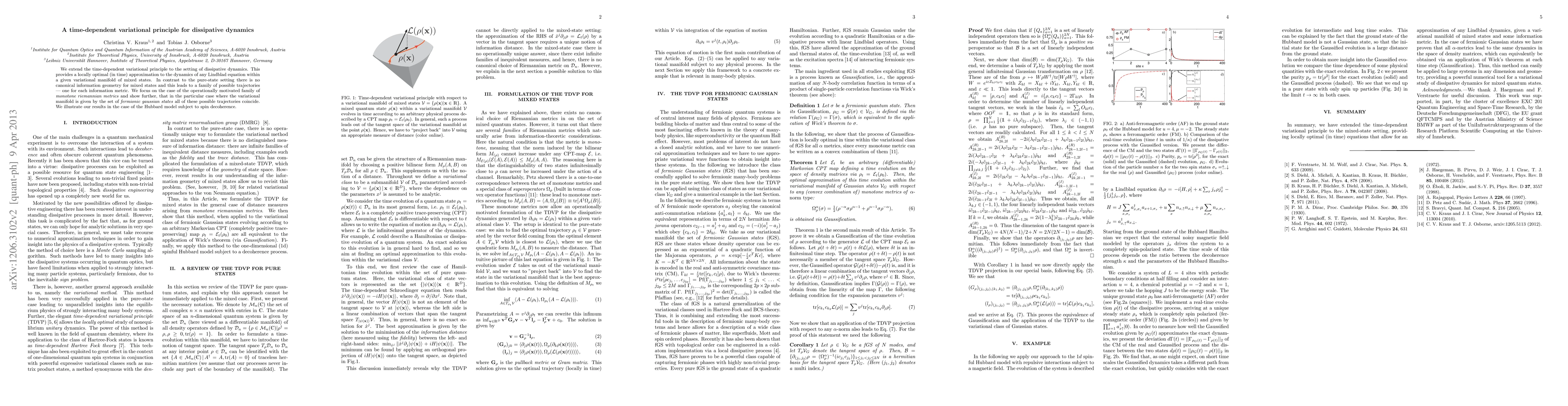 This paper extends the time-dependent variational principle to dissipative dynamics, offering a locally optimal approximation for Lindblad equations within a variational manifold of mixed states. It highlights that different information metrics lead to various trajectories, but for fermionic Gaussian states, all coincide, as demonstrated in the Hubbard model with spin decoherence.