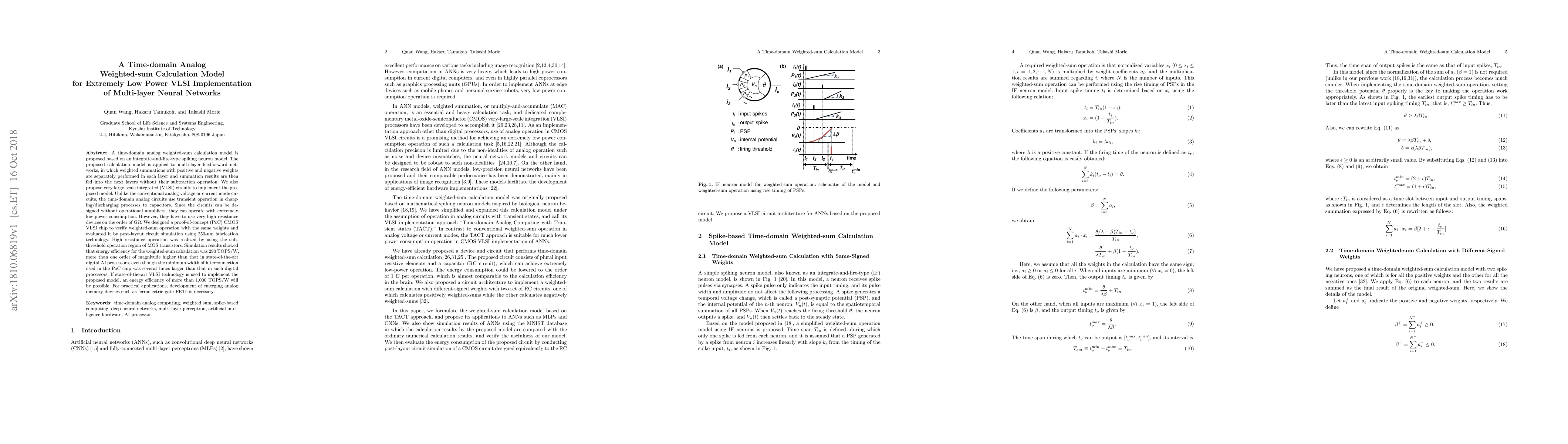 A time-domain analog weighted-sum calculation model is proposed based on an integrate-and-fire-type spiking neuron model. The proposed calculation model is applied to multi-layer feedforward networks, in which weighted summations with positive and negative weights are separately performed in each layer and summation results are then fed into the next layers without their subtraction operation. We also propose very large-scale integrated (VLSI) circuits to implement the proposed model. Unlike the conventional analog voltage or current mode circuits, the time-domain analog circuits use transient operation in charging/discharging processes to capacitors. Since the circuits can be designed without operational amplifiers, they can operate with extremely low power consumption. However, they have to use very high resistance devices on the order of G$\rm \Omega$. We designed a proof-of-concept (PoC) CMOS VLSI chip to verify weighted-sum operation with the same weights and evaluated it by post-layout circuit simulation using 250-nm fabrication technology. High resistance operation was realized by using the subthreshold operation region of MOS transistors. Simulation results showed that energy efficiency for the weighted-sum calculation was 290~TOPS/W, more than one order of magnitude higher than that in state-of-the-art digital AI processors, even though the minimum width of interconnection used in the PoC chip was several times larger than that in such digital processors. If state-of-the-art VLSI technology is used to implement the proposed model, an energy efficiency of more than 1,000~TOPS/W will be possible. For practical applications, development of emerging analog memory devices such as ferroelectric-gate FETs is necessary.