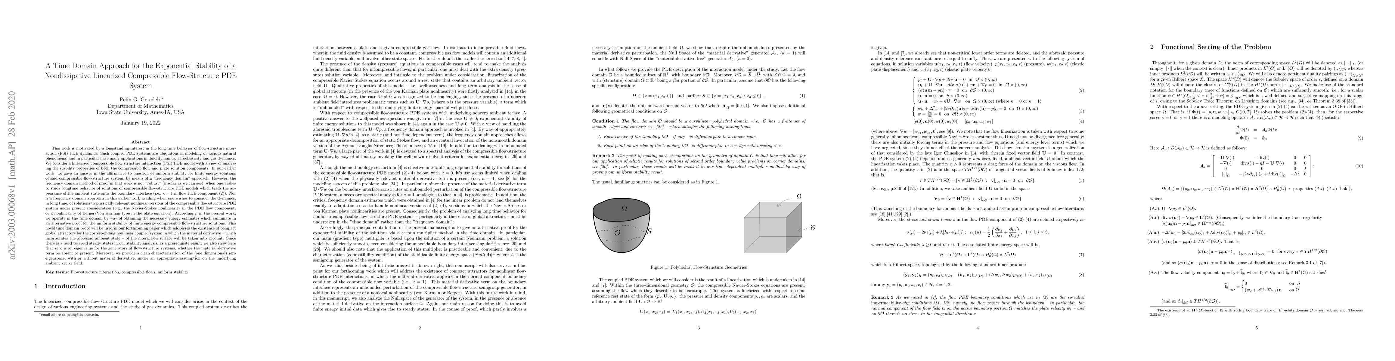 This paper presents a time domain approach to prove the exponential stability of a linearized compressible flow-structure PDE system, addressing limitations of previous frequency domain methods. The new proof provides robust stability analysis for long-time behavior and nonlinear dynamics of the system.