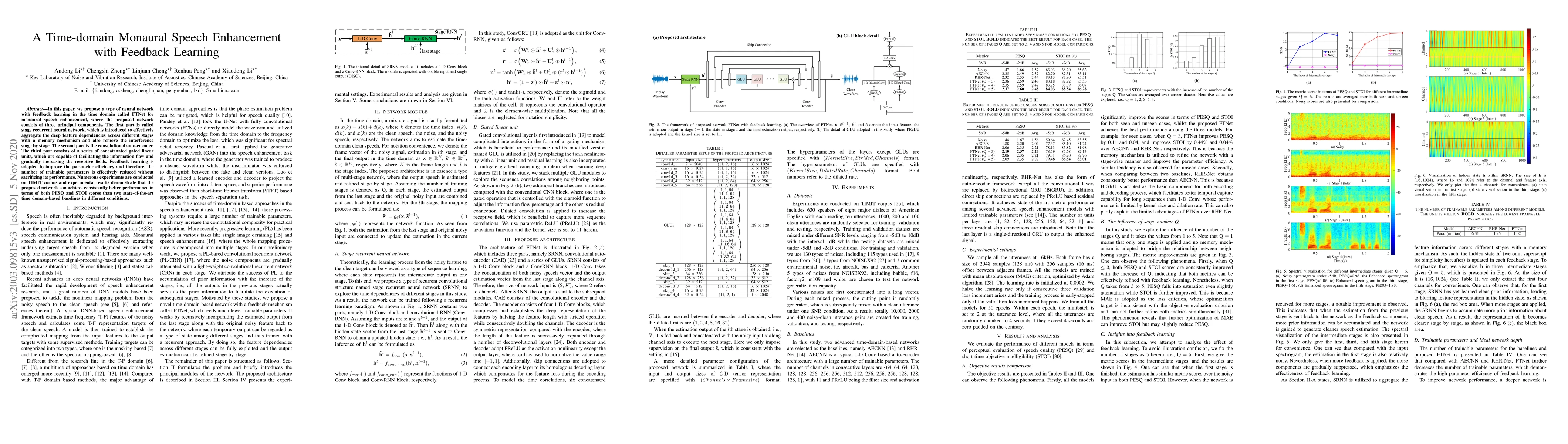 This paper introduces FTNet, a neural network with feedback learning for monaural speech enhancement, comprising a stage recurrent neural network, a convolutional auto-encoder, and concatenated gated linear units. Experiments show FTNet outperforms state-of-the-art baselines in terms of PESQ and STOI scores.