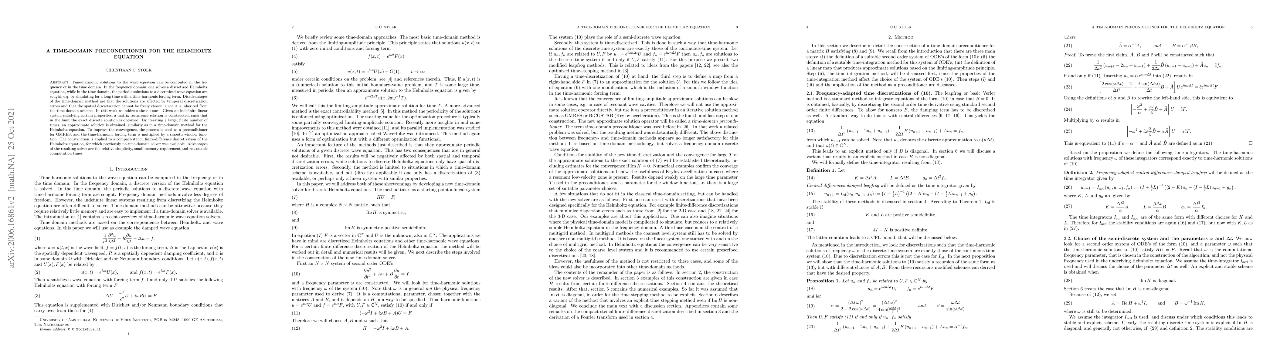 This paper proposes a time-domain preconditioner for solving the Helmholtz equation, addressing temporal and spatial discretization issues inherent in time-domain methods. The method uses a matrix recurrence relation to iteratively approximate solutions, improving convergence when used as a preconditioner for GMRES.