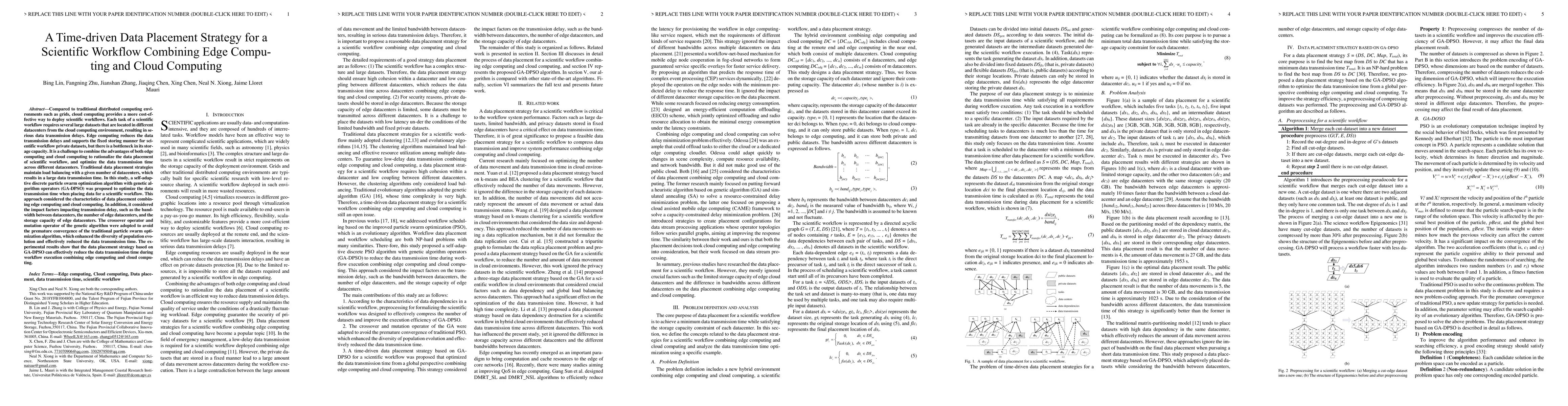This paper proposes a self-adaptive GA-DPSO algorithm to optimize data placement for scientific workflows by combining edge computing and cloud computing, aiming to reduce data transmission delays. The approach considers bandwidth, edge datacenter numbers, and storage capacities, using genetic operators to enhance optimization and reduce transmission time. Experimental results show significant improvements in data transmission efficiency.