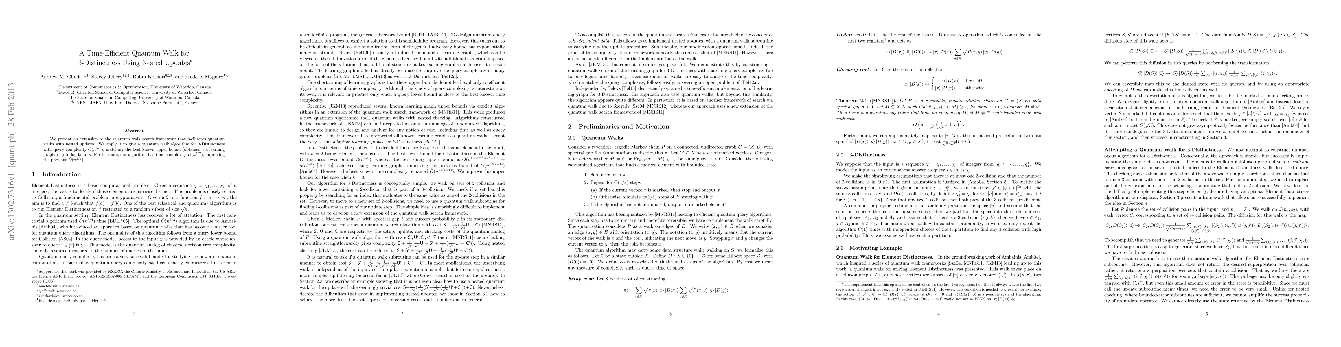 This paper introduces a quantum walk algorithm for the 3-Distinctness problem using nested updates, achieving a query complexity of ~O(n^{5/7}) and a time complexity of ~O(n^{5/7}), matching the best known upper bound and improving previous results.