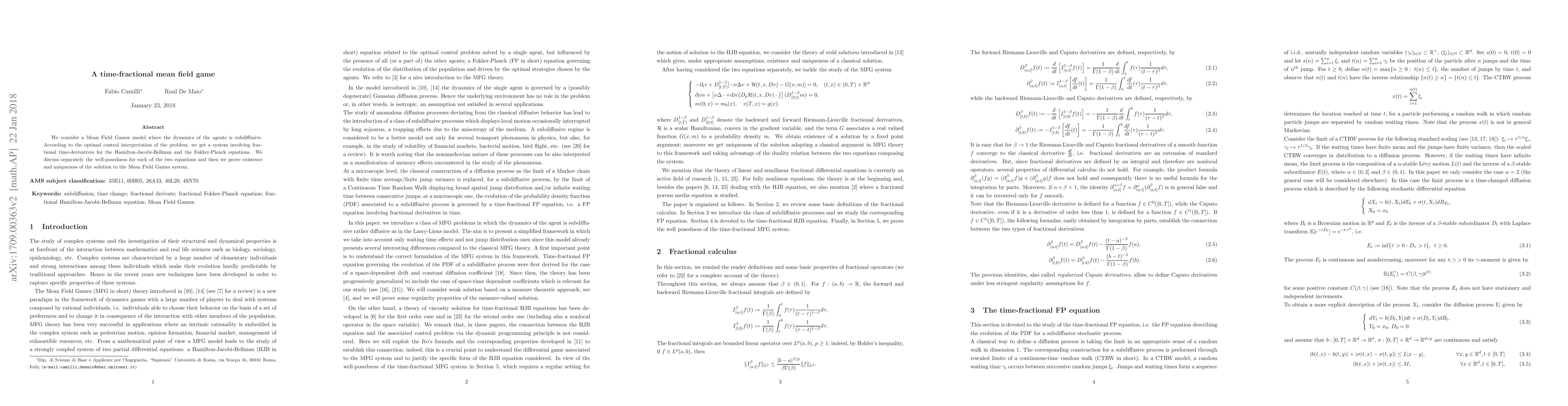 This paper explores a Mean Field Game model with subdiffusive agent dynamics, introducing fractional time-derivatives into the Hamilton-Jacobi-Bellman and Fokker-Planck equations. It establishes the well-posedness of each equation and proves the existence and uniqueness of solutions to the overall system.