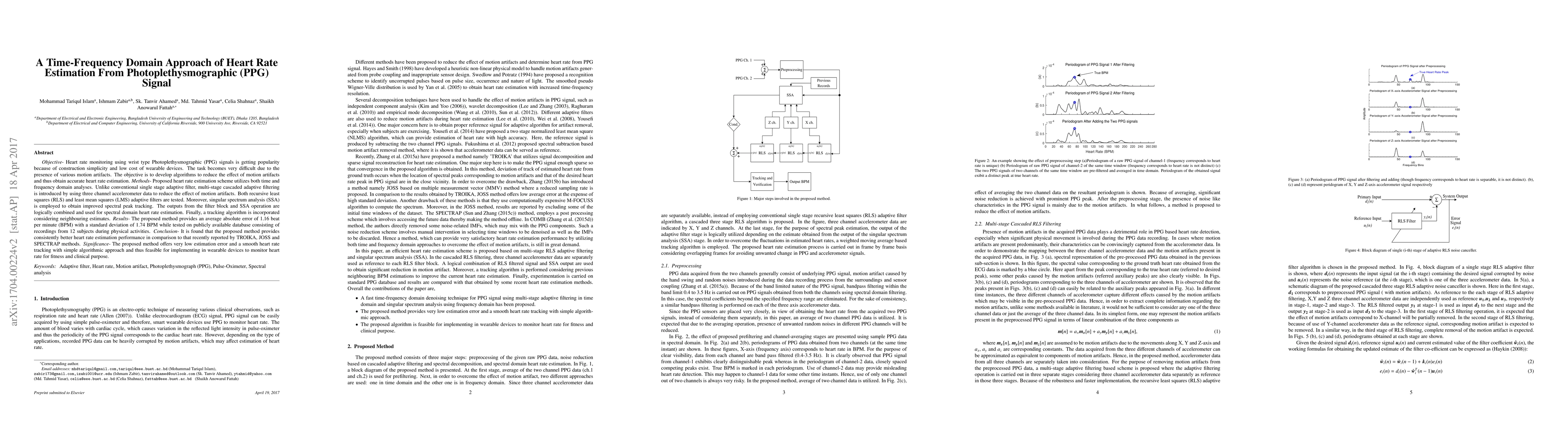 This paper proposes a time-frequency domain approach for accurate heart rate estimation from PPG signals, utilizing multi-stage adaptive filtering and singular spectrum analysis to reduce motion artifacts. The method achieves an average absolute error of 1.16 BPM, demonstrating superior performance compared to existing techniques.