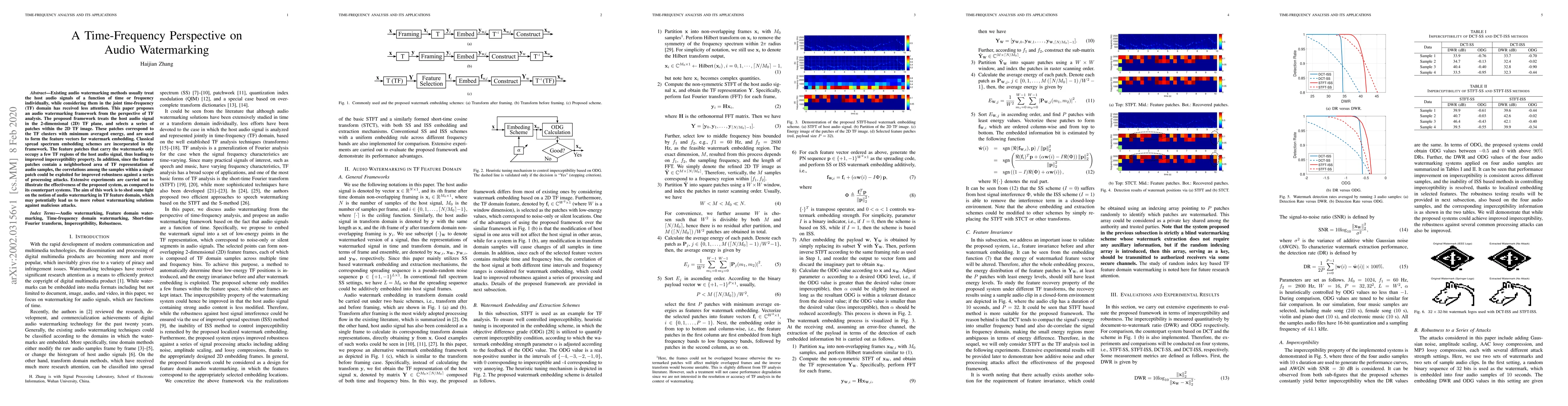 This paper proposes an audio watermarking framework that leverages time-frequency (TF) analysis to embed watermarks in patches of the TF plane corresponding to regions with minimal averaged energy. The approach enhances both imperceptibility and robustness against attacks by utilizing TF representations and classical spread spectrum embedding.