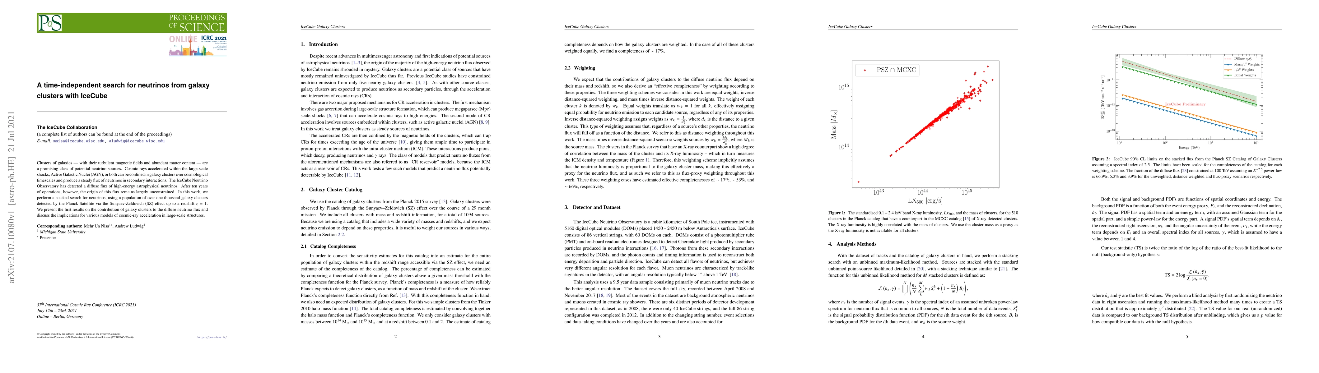 This study uses IceCube data to search for neutrinos from galaxy clusters, which are potential sources due to cosmic ray interactions. Despite ten years of IceCube operations, the origin of its high-energy astrophysical neutrinos remains unclear; this work stacks data from over a thousand galaxy clusters to investigate their contribution to the diffuse neutrino flux.