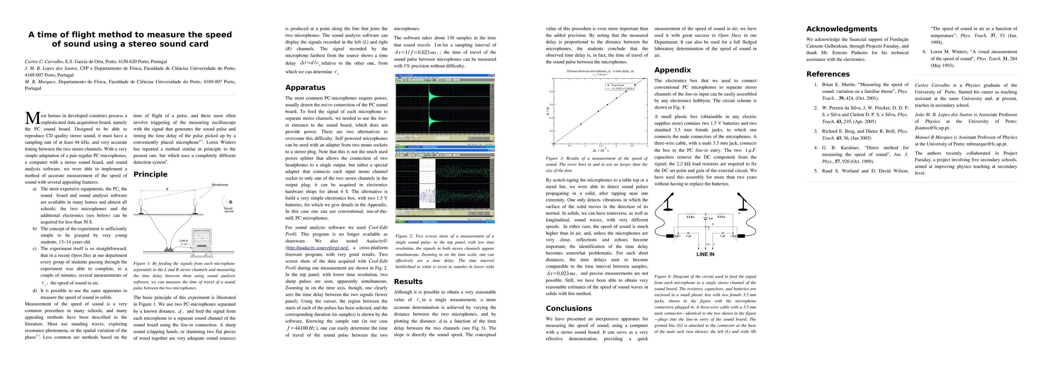 This paper describes a low-cost method for measuring the speed of sound using a stereo sound card in a computer. Students can determine the speed by timing the delay between sound pulses arriving at two microphones at different distances, offering a practical demonstration and laboratory exercise.