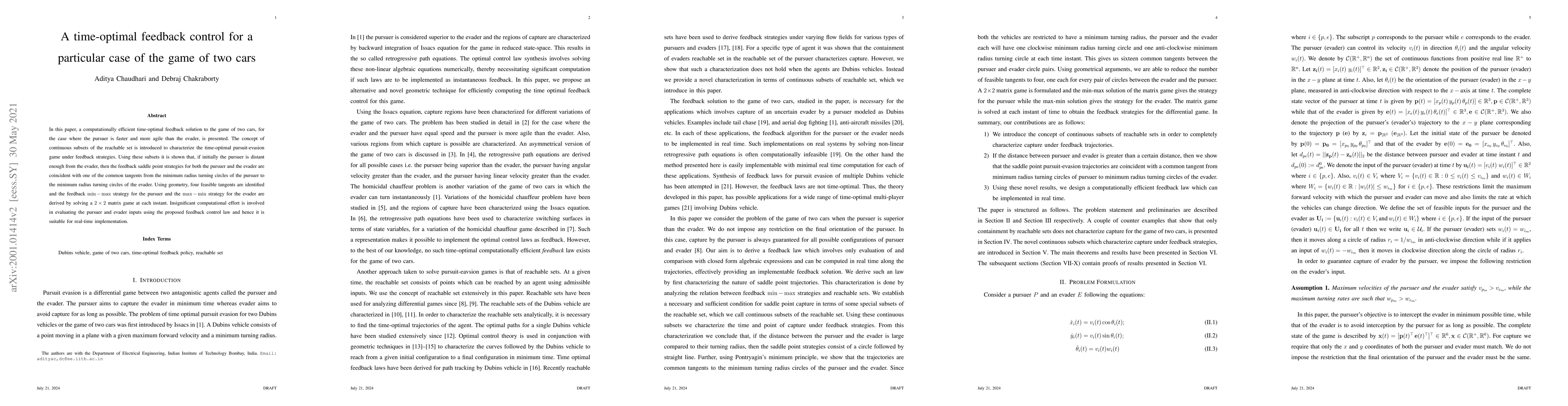 Researchers developed a time-optimal feedback control law for a game of two cars where one car is faster and more agile than the other, enabling real-time pursuit evasion strategies that balance safety and speed.