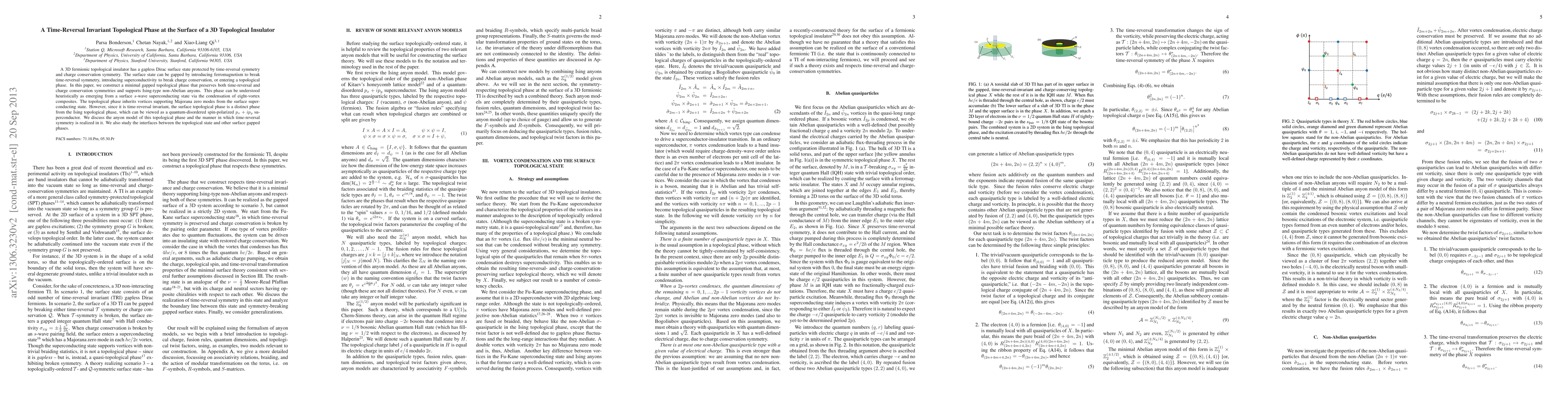 This paper constructs a minimal gapped topological phase on the surface of a 3D topological insulator that preserves both time-reversal and charge conservation symmetries, supporting Ising-type non-Abelian anyons. The phase emerges from a surface s-wave superconducting state via vortex condensation, distinguishing it from other topological phases.