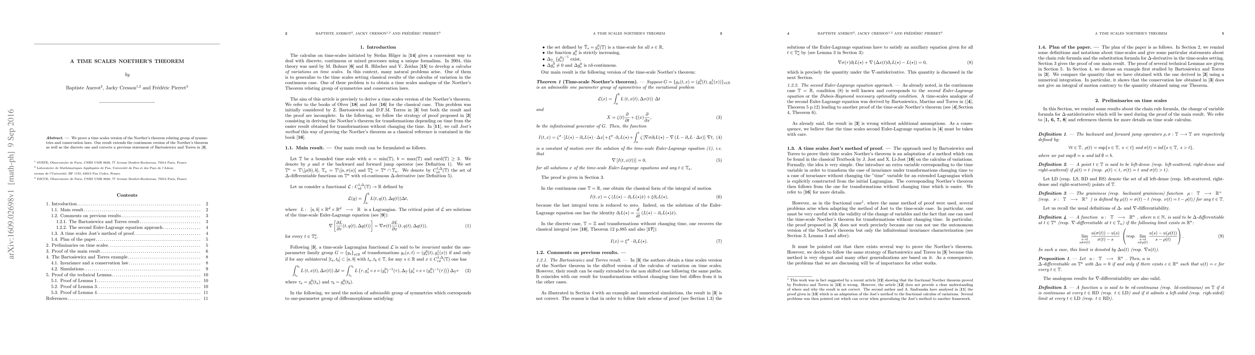 This paper proves a time scales version of Noether's theorem, linking symmetries and conservation laws, extending both continuous and discrete versions, and correcting a prior statement by Bartosiewicz and Torres.